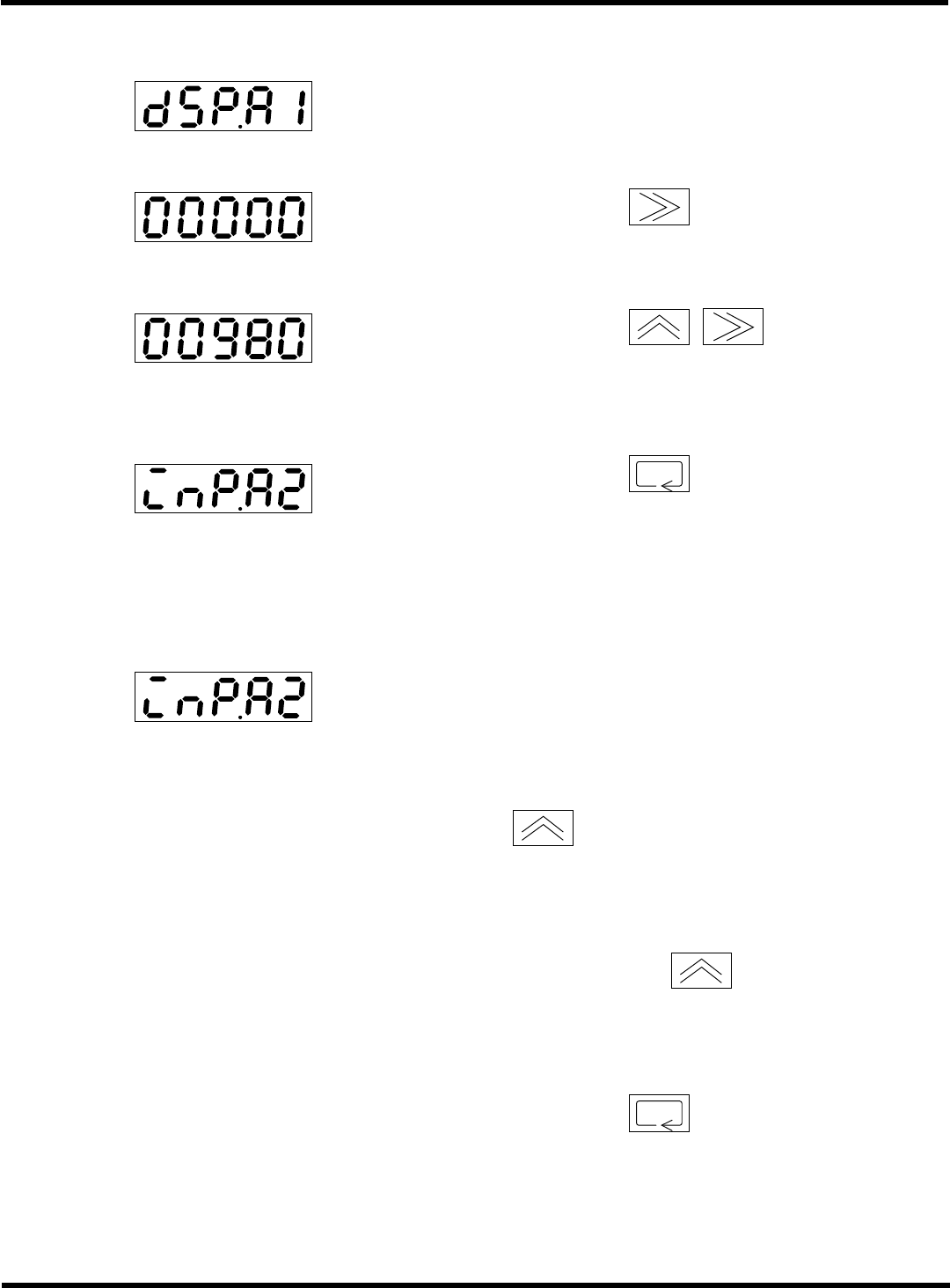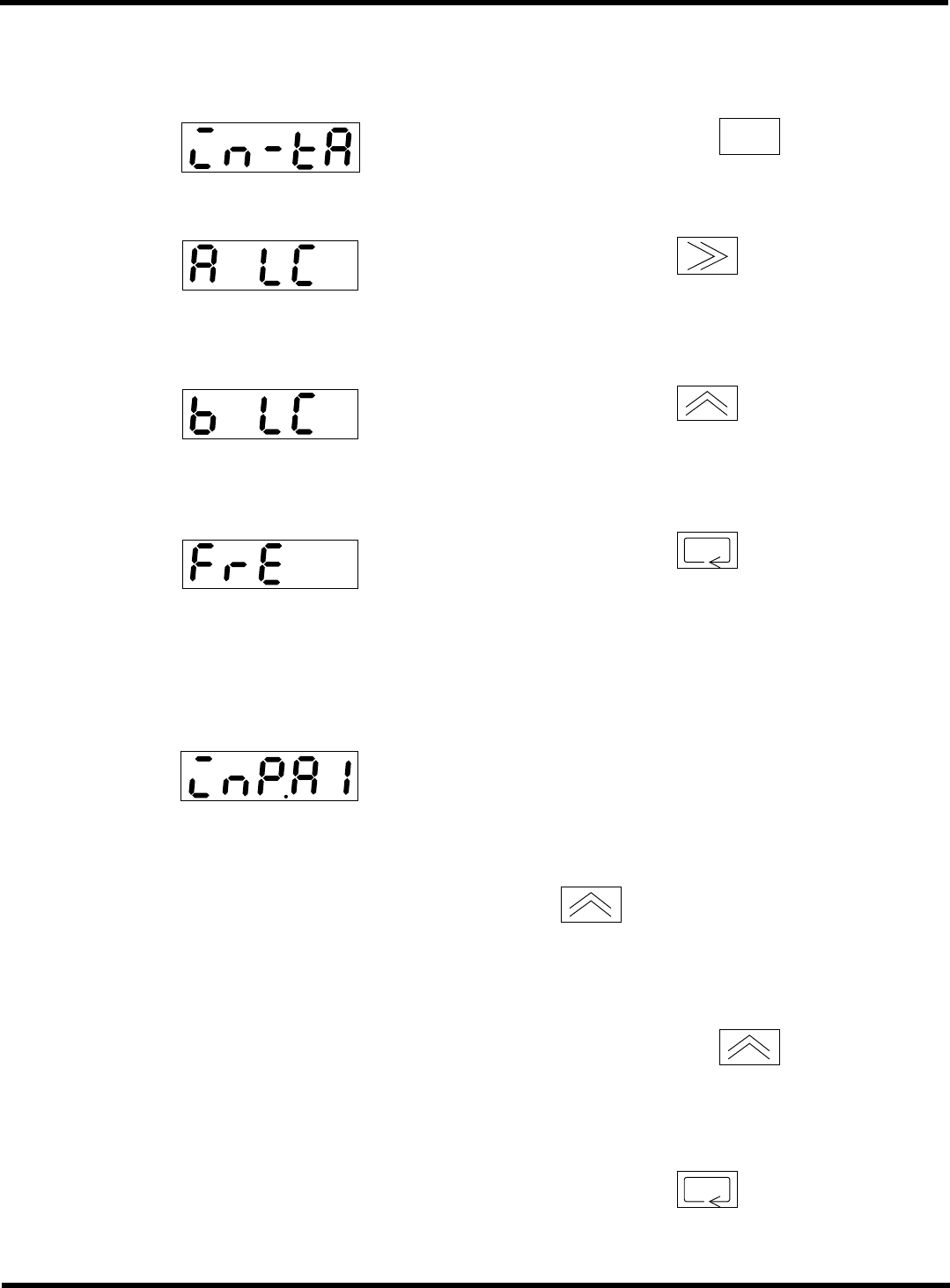 CM602-L 维修手册 2.2 机器参数的示教步 骤 Page 2-1 33 1. 输入范围的设定 1. 投入电源后,按 3 秒以上。 2. 按显示部的 1 次, ‘A LC’ 将会闪 烁。 3. 按显示部的 数次,使 ‘b LC’ 显示 出来。 4. 按显示部的 来确定。 2. 输入值 1 的设定 1. 将画面显示设定为 ‘InP.A1’ 。 2. 将 100 g 砝码放在测力传感器上,然后按 1 次。 • 画面显示将会处于闪烁 状…