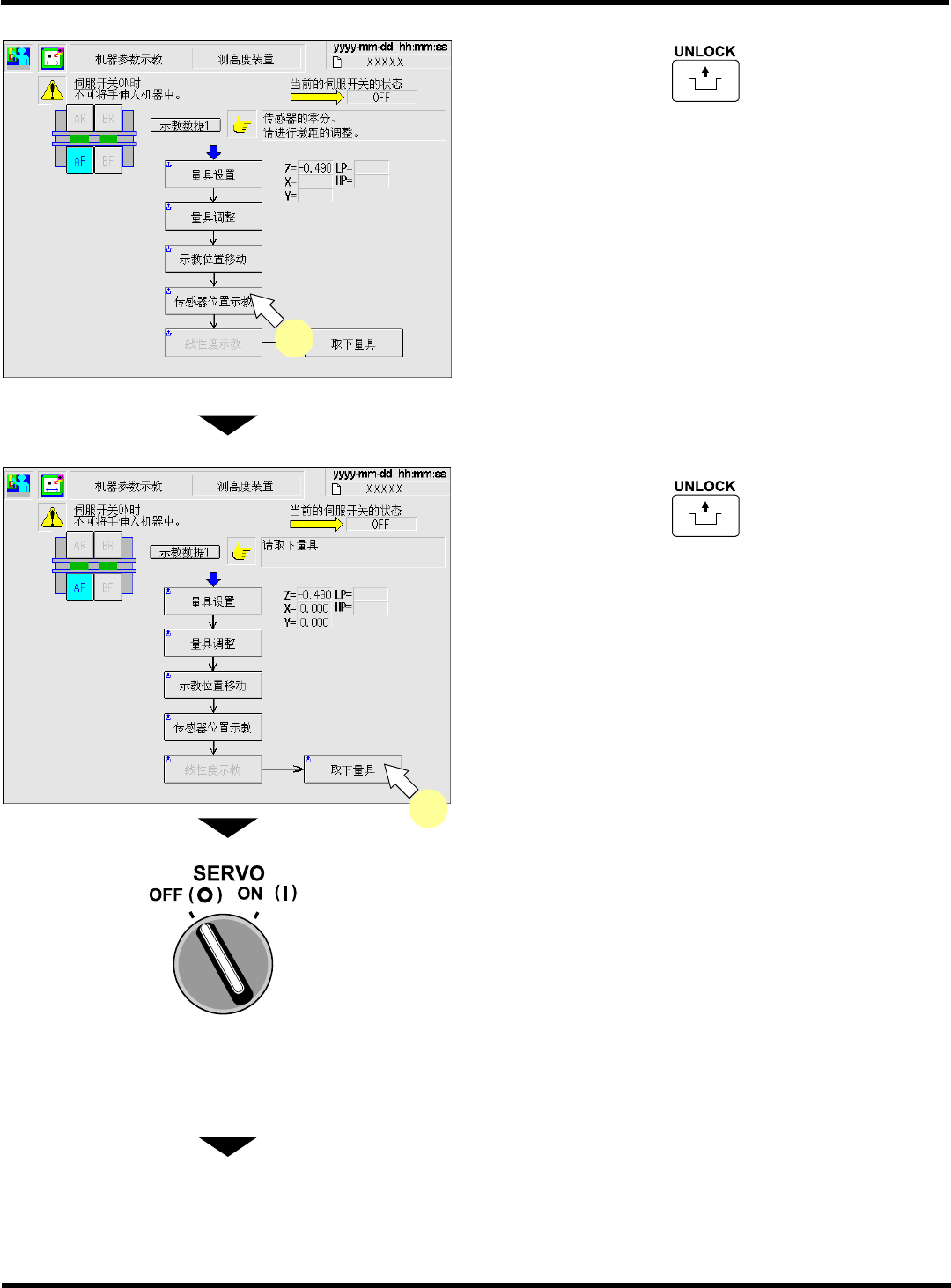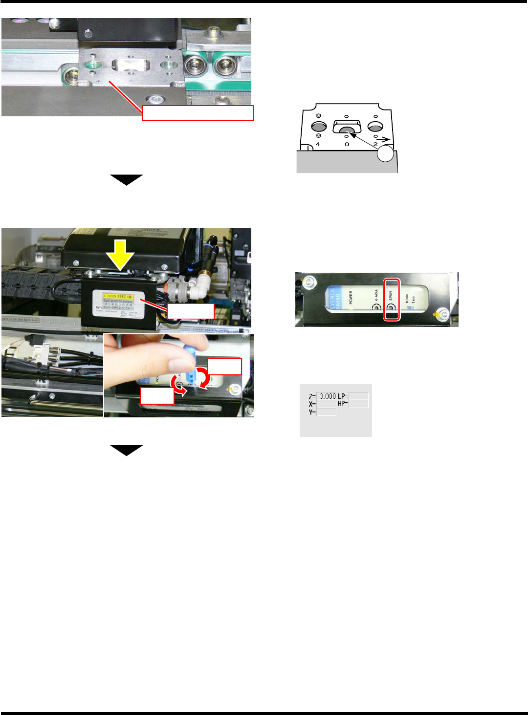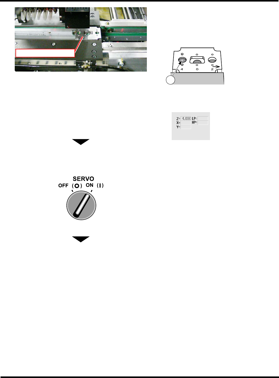 CM602-L 维修手册 2.2 机器参数的示教步 骤 Page 2-1 47 18. 用手动方式将移载吸头移至基板弯曲传感 器治具的 “4 mm” 位置。 ∗ 请确认传感器的照射光 位于 “4 mm” 位置的孔之 中央 位置。 ∗ 请确认画面右中央的 ‘Z=’ 数值在 4.000 ± 0.020 的范围内。 ∗ 数值不在 4.000 ± 0.020 的范围时,请从步 骤 14. 再次进行操作。 19. 关闭安全盖。 20. 将伺服…