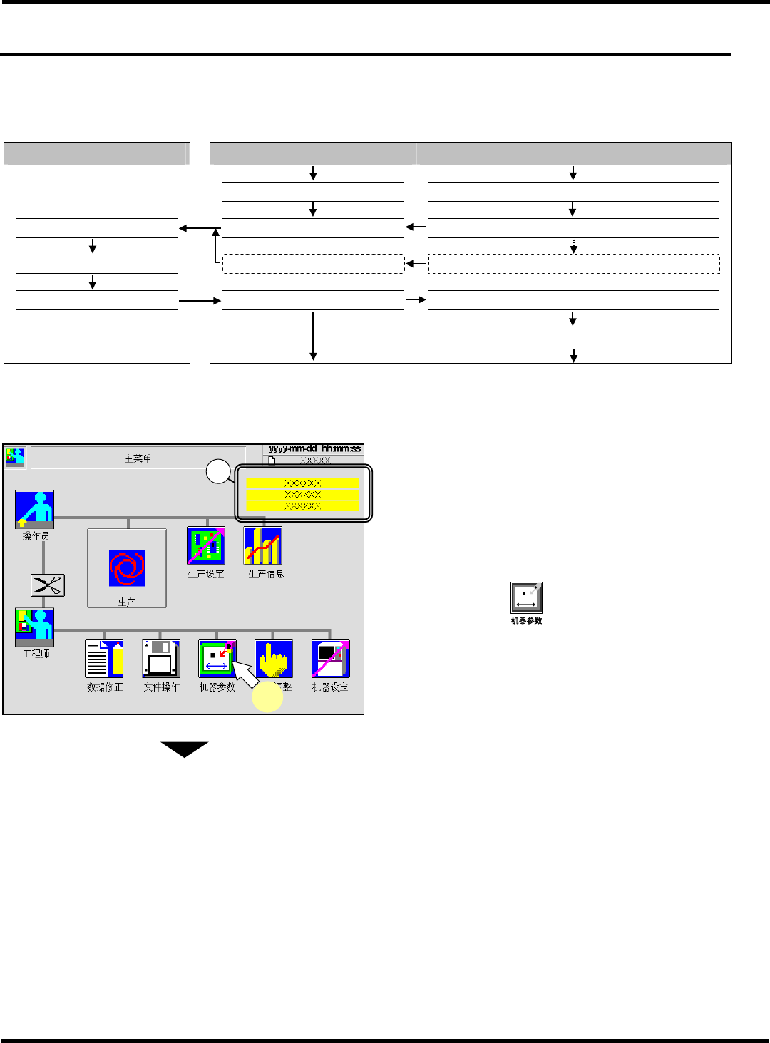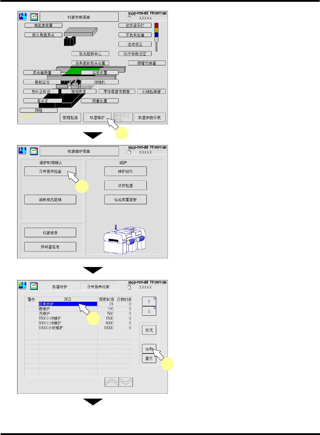 CM602-L 维修手册 1.1 维护的概要 Page 1-2 1. 1.1 维护的概要 本机器根据事先设定的 周期和运行时 间自动计算出 定期检查的时期并通 知给客户。 在维护之后, 输 入作业完了的信息后, 作业日期就会 作为履历保存 起来。 另外, 该信息还会成 为计算下一次 维护时 间的标准使用。 客户 画面 机器 通常显示 自上次维护开始的累计 运行时间 确认作业内容 黄色闪烁的项目显示 表明已超过周期时间的 90% 维护作业…