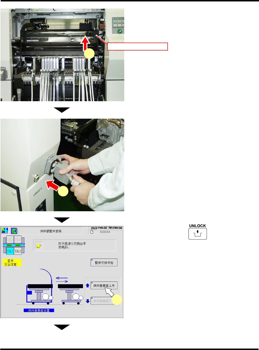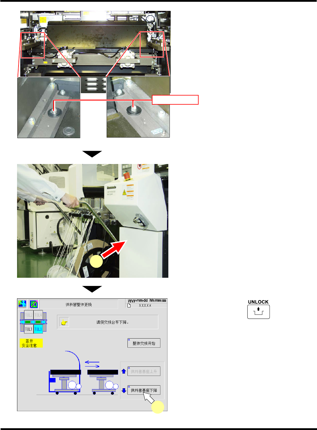 CM602-L 维修手册 1.2 检查时经常进行的 作业 Pa ge 1-39 9. 确认定位销的周围是否有芯片等异物。 ∗ 有异物时要清除干净。 10. 把整体交换台车推进去。 11. 按动操作面板上的 + [ 供料器基 座下降 ] 。 12. 将供料器工作台的盖关闭, 再关闭安全盖。 EJM8A- C-MMC01- A02-0 0 EJM8A -Pc-0034 11 EJM4A -052P 4Z4C-481P 4Z4C-482P 定…