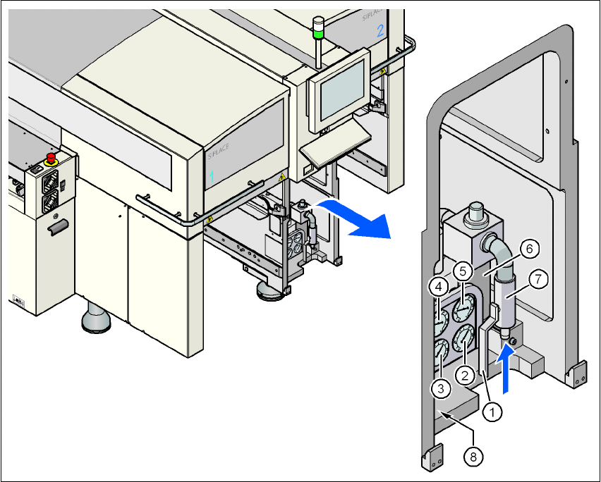 사용자 매뉴얼 SIPLACE D3 4 셋업 및 시운전 소프트웨어 버전 SR.605.xx 2008 년 7 월 한글판 4.2 설치 위치의 설비 상황 187 4. 2.2 .2 장비의 압 축 공기 연결 4 그림 4.2 - 1 압축 공기 라인 연결 (1) "OPEN" 위치에 있는 정지 밸브 (2) 장비의 컴포넌트 공급 압력 확인을 위한 압력계 정상 압력 : 0.5 ± 0.025 MP…