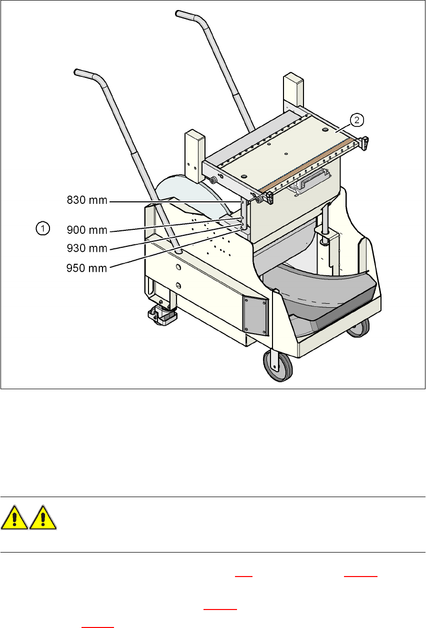 사용자 매뉴얼 SIPLACE D3 4 셋업 및 시운전 소프트웨어 버전 SR.605.xx 2008 년 7 월 한글판 4.4 컴포넌트 트롤리를 PCB 컨베이어 높이로 조정 247 4 그림 4.4 - 1 PCB 컨베이어 높이가 950 mm 인 컴포넌트 트롤리 (1) 컨베이어 높이를 830 mm 에서 950 mm 로 맞출 수 있는 가이드 열에 있는 구멍 (2) 컴포넌트 트롤리 테이블 4.4 .3 컴…
