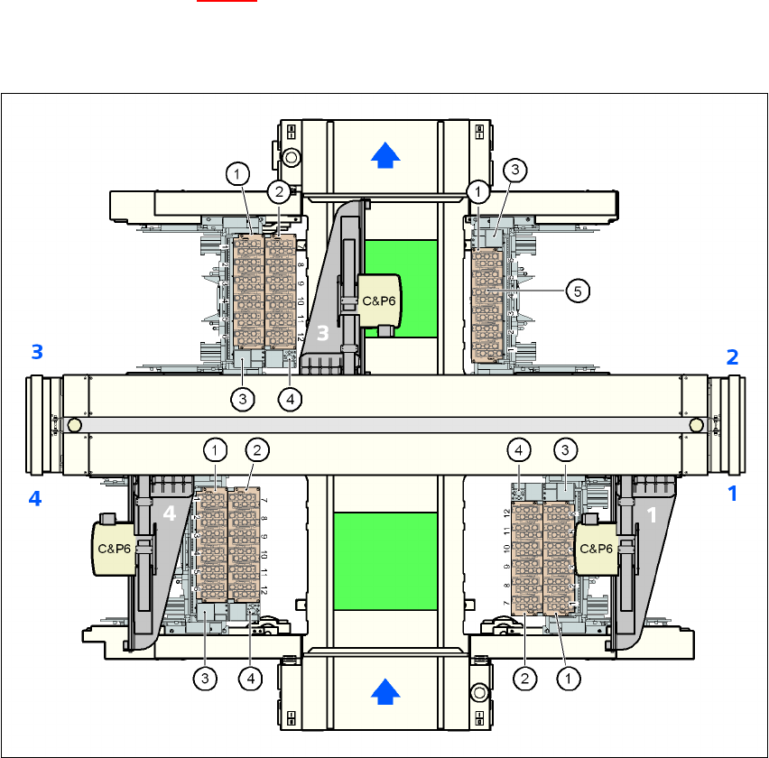 6- 세그먼트 Collect&Place 헤드의 경우 위치 1, 3 및 4 에 하나 또는 두 개의 노즐 체인저를 설