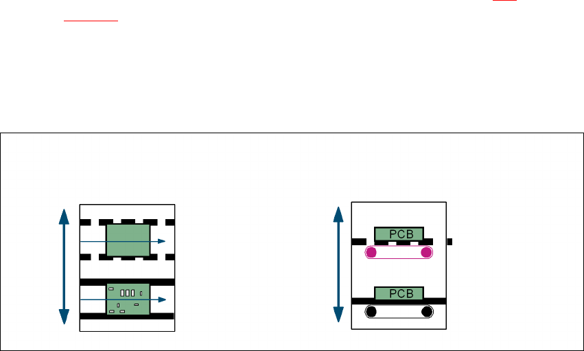 두 개의 컨베이어 벨트가 비어있거나 실장된 PCB 를 장비 아래에서 이송합니다 (341 페이지에