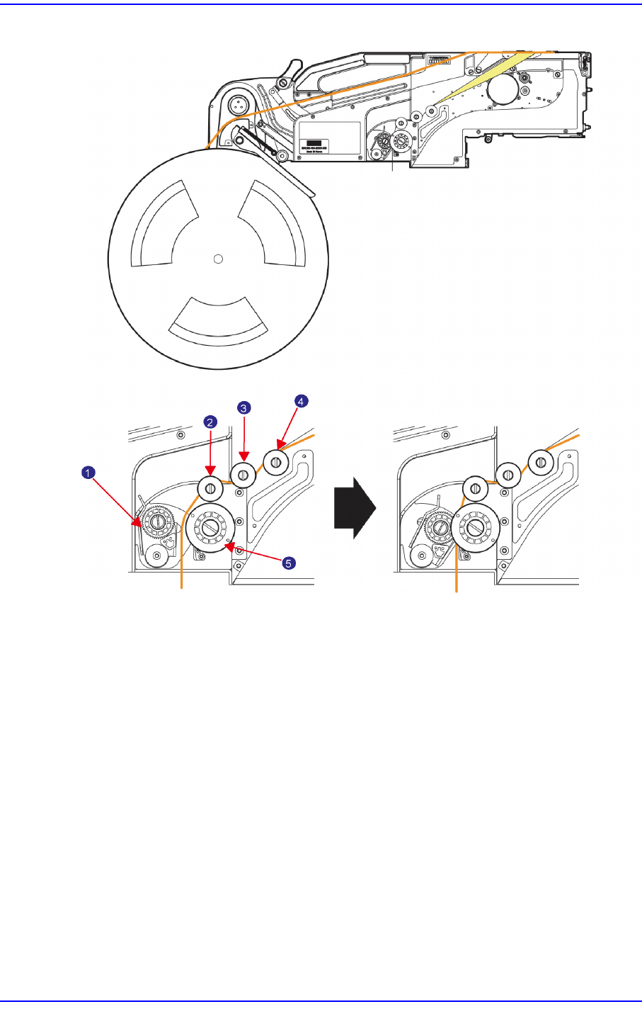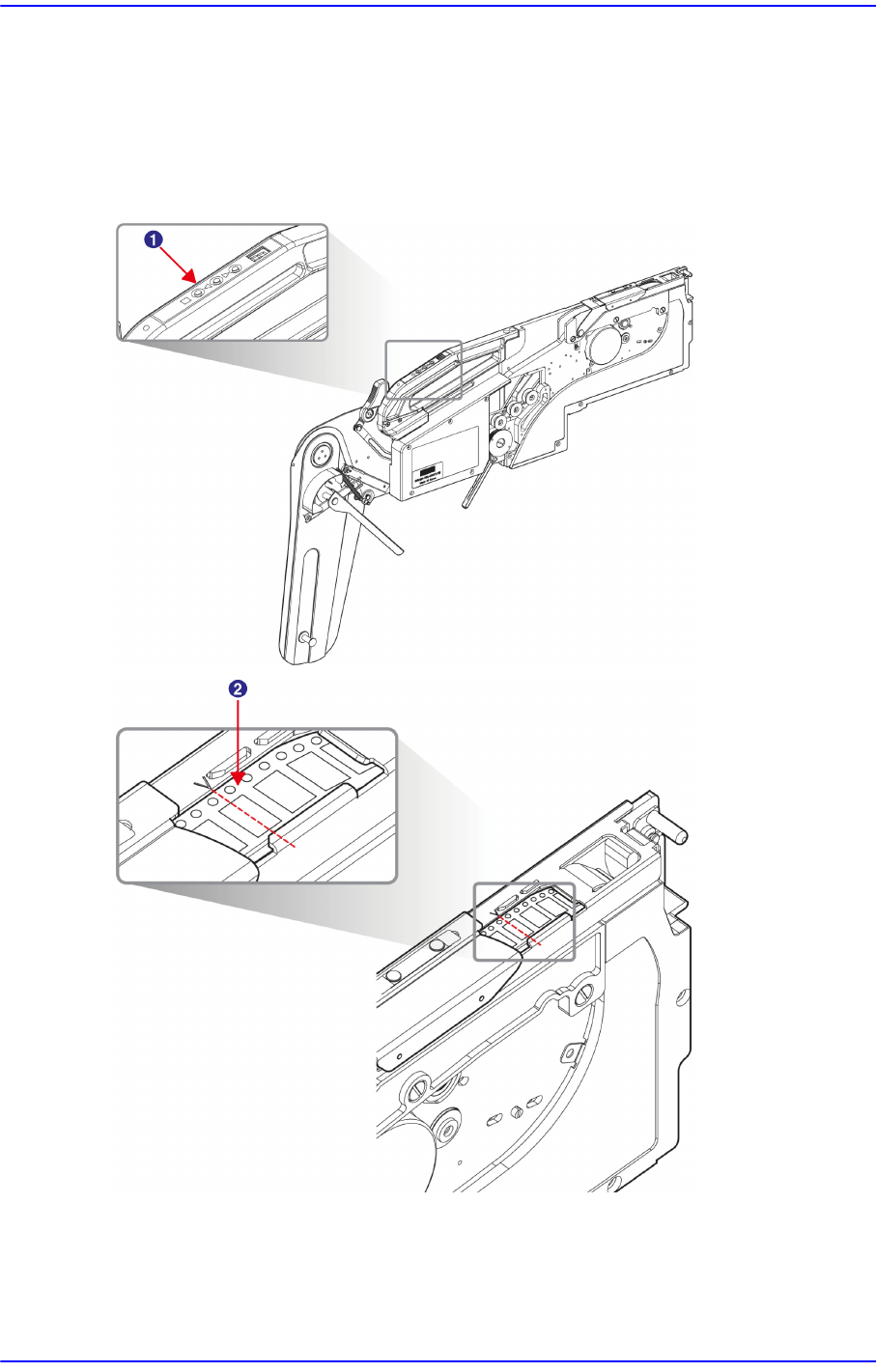 2-18 SM-Series SME 带式喂料带式器的操作手册 2.2.6. 拾取点位置设置 SME 带式供料器利用位于手 柄 (handle) 上的操作面 板的前进键与后退键把元器件移 送到拾取位置。 此时, 快门只能看到待拾取的元器件, 其余元器件 ( 芯片 ) 则加以覆 盖。 图 2.21 12~88mm 喂料器的拾取点位置设置 1: 操作键 2: 拾取位置