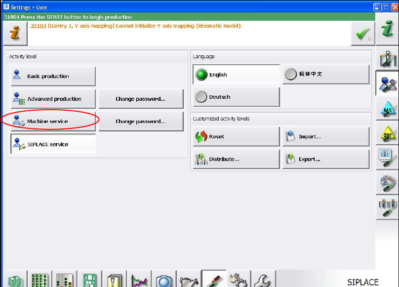 ► Click the Machine service button and enter the password to change into this activity level.
