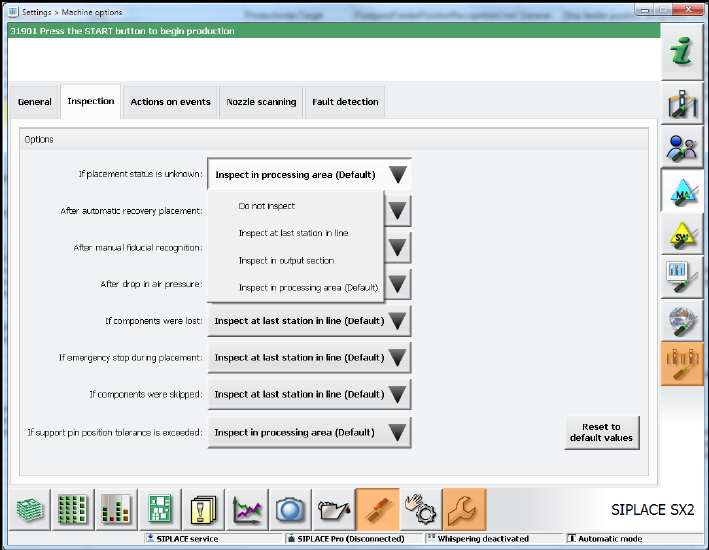 default values. If necessary, the inspection options have to be adjusted under Settings – Machine