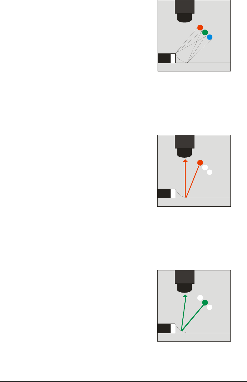 2.5.6 蓝色照明 同样原理, 如图所示, 只有照射在急倾 斜的焊锡表面的蓝色光才能反射到摄像机, 摄像机对急倾斜焊锡表面部分摄取到蓝色 画像。 2.5.7 焊锡弧度和画像的关系 图示为在彩色高亮度方式下焊锡表面 的倾斜和摄像机摄取画像的颜色分布关系。 2.5.8 实际图像 根据以上成像原理,实际成像最终如图。