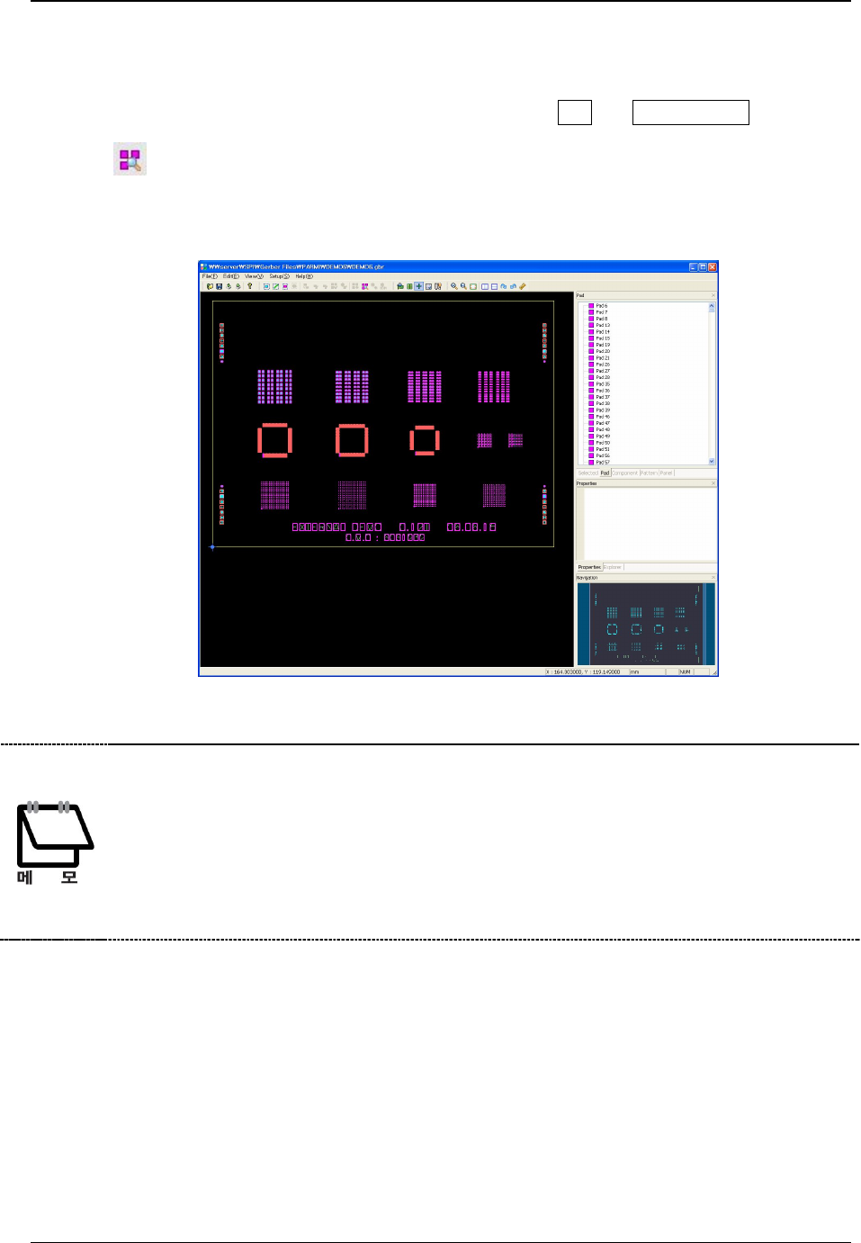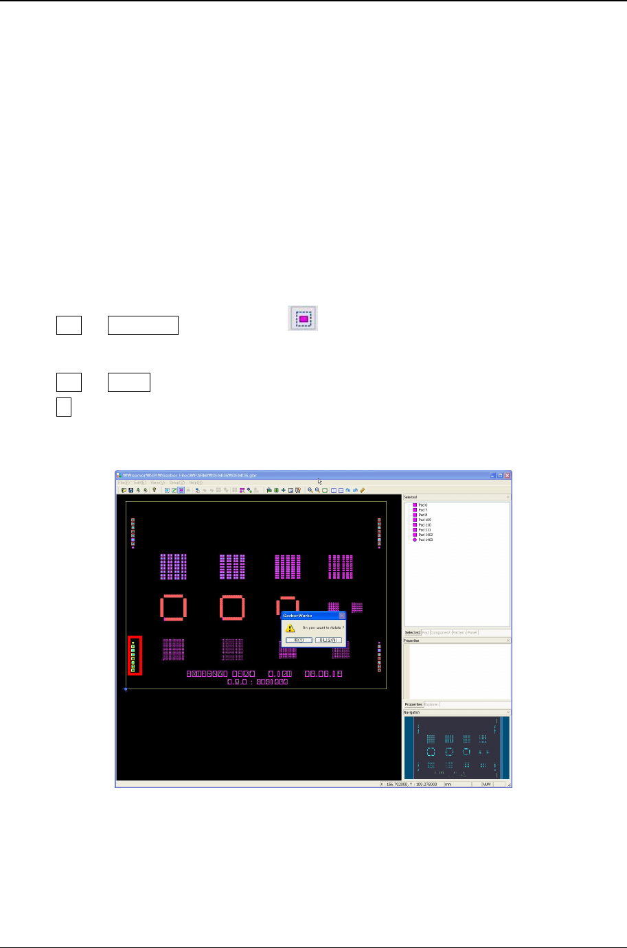 3. Gerber W orks 教 示软件操作过 程 PARMI CO ., LTD. 41 REV 1 . 0 3.9 自 动读 取Pad (F ind all pads) 在 Gerber W orks 里 ,通过影像处理演算 ,自动读取 Pa d. 菜 单 Edit -> Find All Pads 或工具窗 口 点击 按 键 时,全部 基 板 或 阵 列基板 教 示 所 选择 的 基本 阵 列 进行 自 动读 取Pad.…