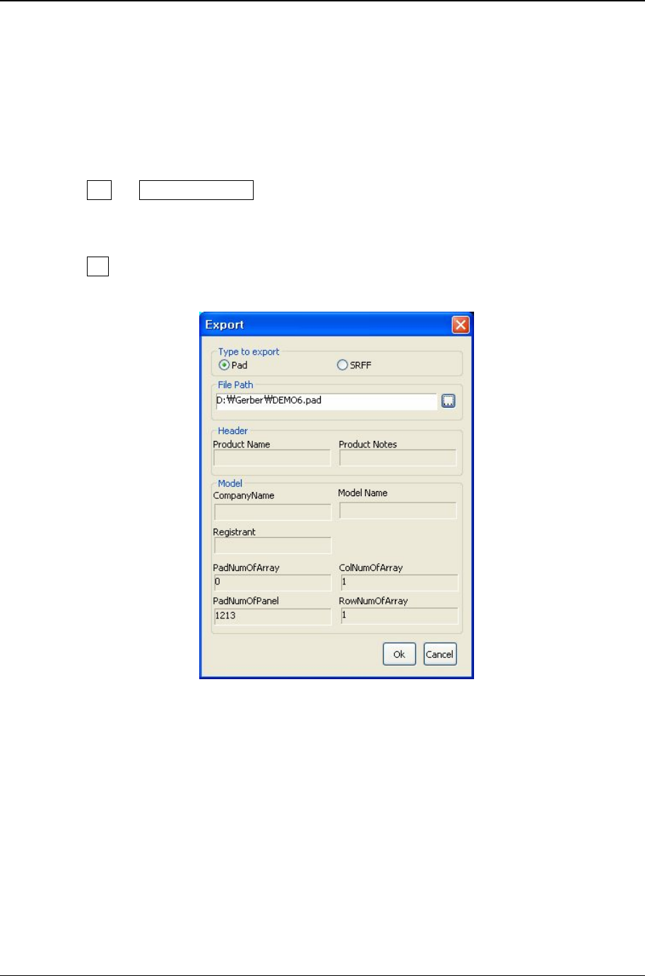 GerberWor ks SPI HS6 0 54 REV 1 . 0 3.12 .2 Pad 文件 导 出 (Export) Pad 文件 导出 后在 检测 机里 可以 使用 的 文 件 形式 .P ad 文 件是 Text 文件 , 规格是 *.pad. n P ad 文件 导 出 ① Fil e -> Export Pad/ S RF F 点击时显示 ‘Export’ 对话 框. ② Type to Expo rt 栏选择 …