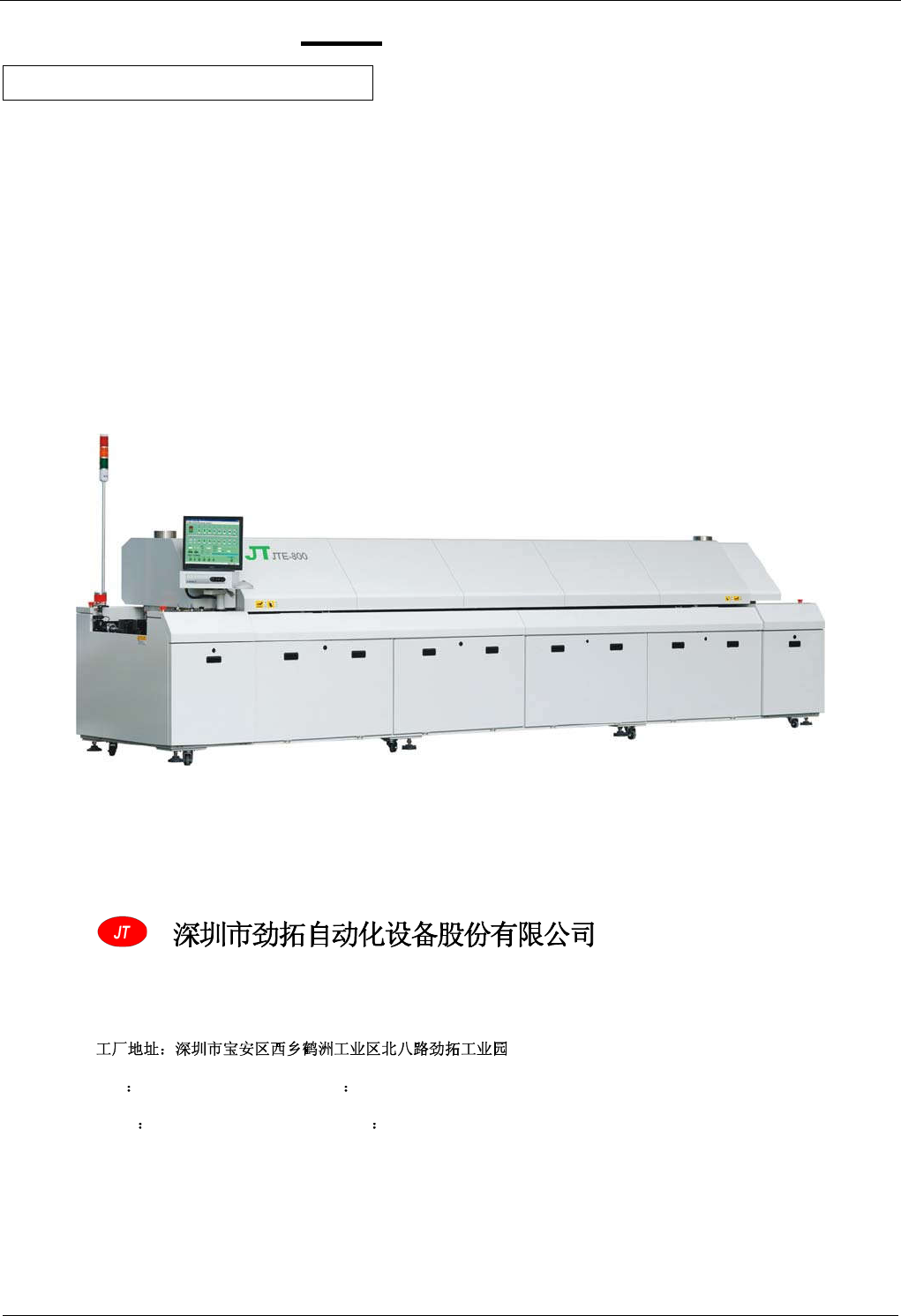 用于所有 JTE 系列无铅热风回流焊机,作为指导用书,主要包括设备的安全防范,安装调试,操作软件的运行