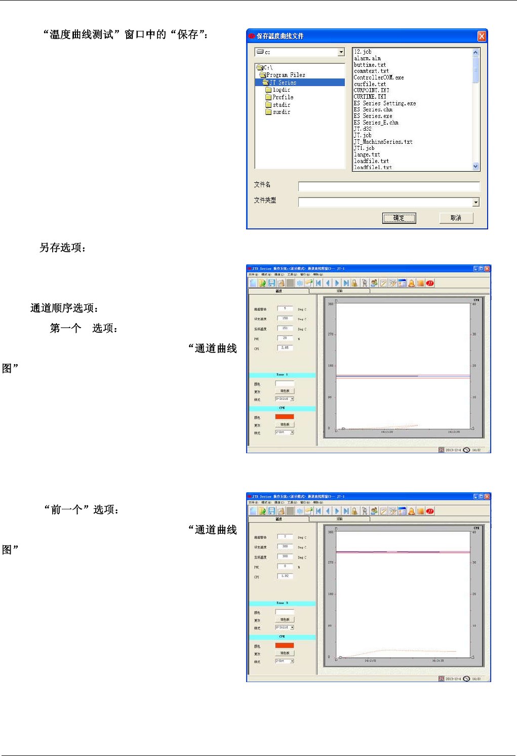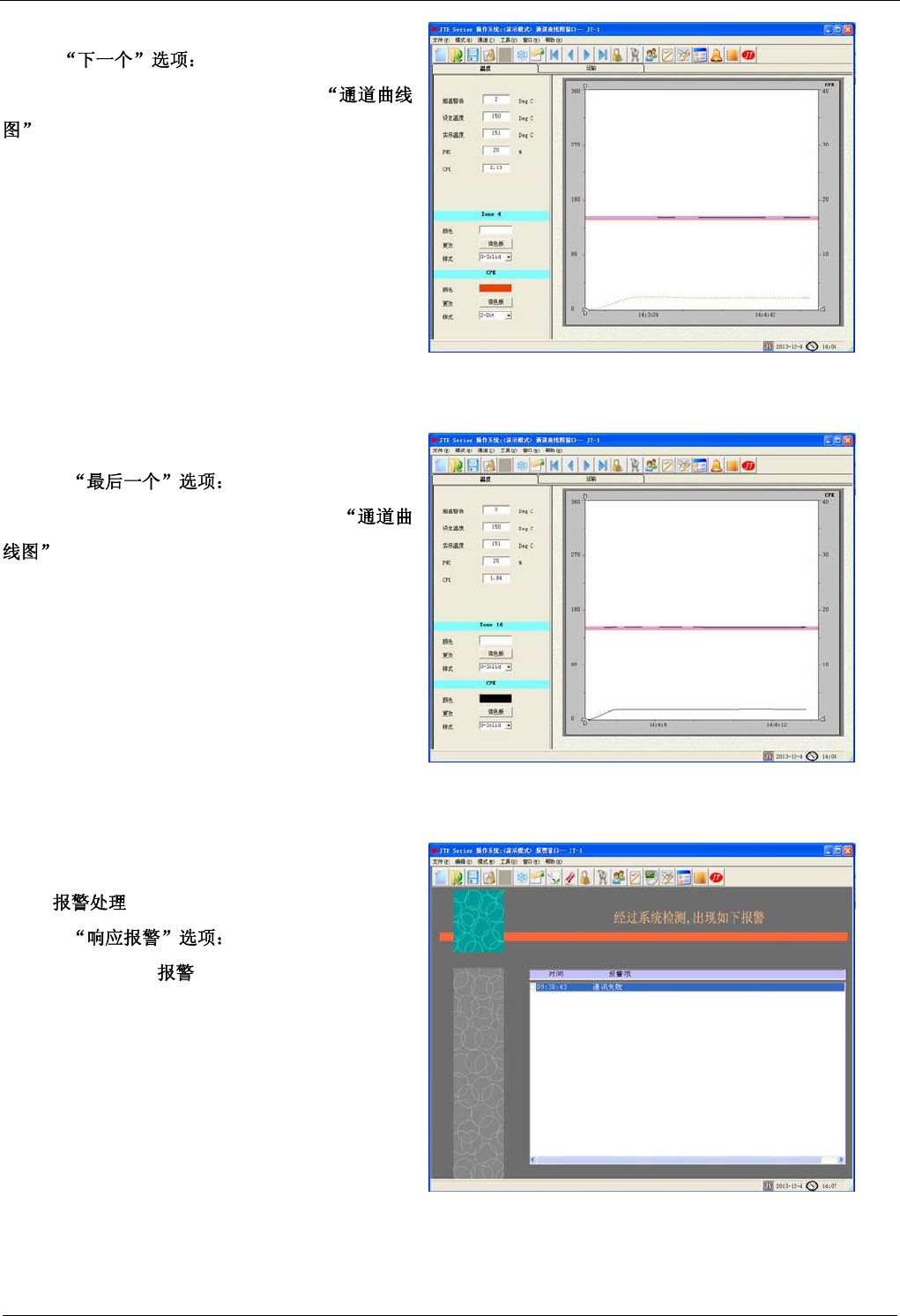 软件操作 JTE 系列无铅回流焊机用户手册 99 - 34 - 4.3.6.2 保存用户测试的温度曲线图及其分析资料。 4.3.6.3 对 打 开 的 文 件 另 名 保 存 。 具 体 操 作 请 参 照 4.3.6.2 小节 4.3.7 4.3.7.1 “ ” 从当前通道跳回第一个通道。 如在 窗口单击此选项,将显示如右图。 4.3.7.2 从当前通道跳到前一个通道。 如在 窗口, 当前通 道是 第四个 通道, 单击此 选项, 将会…