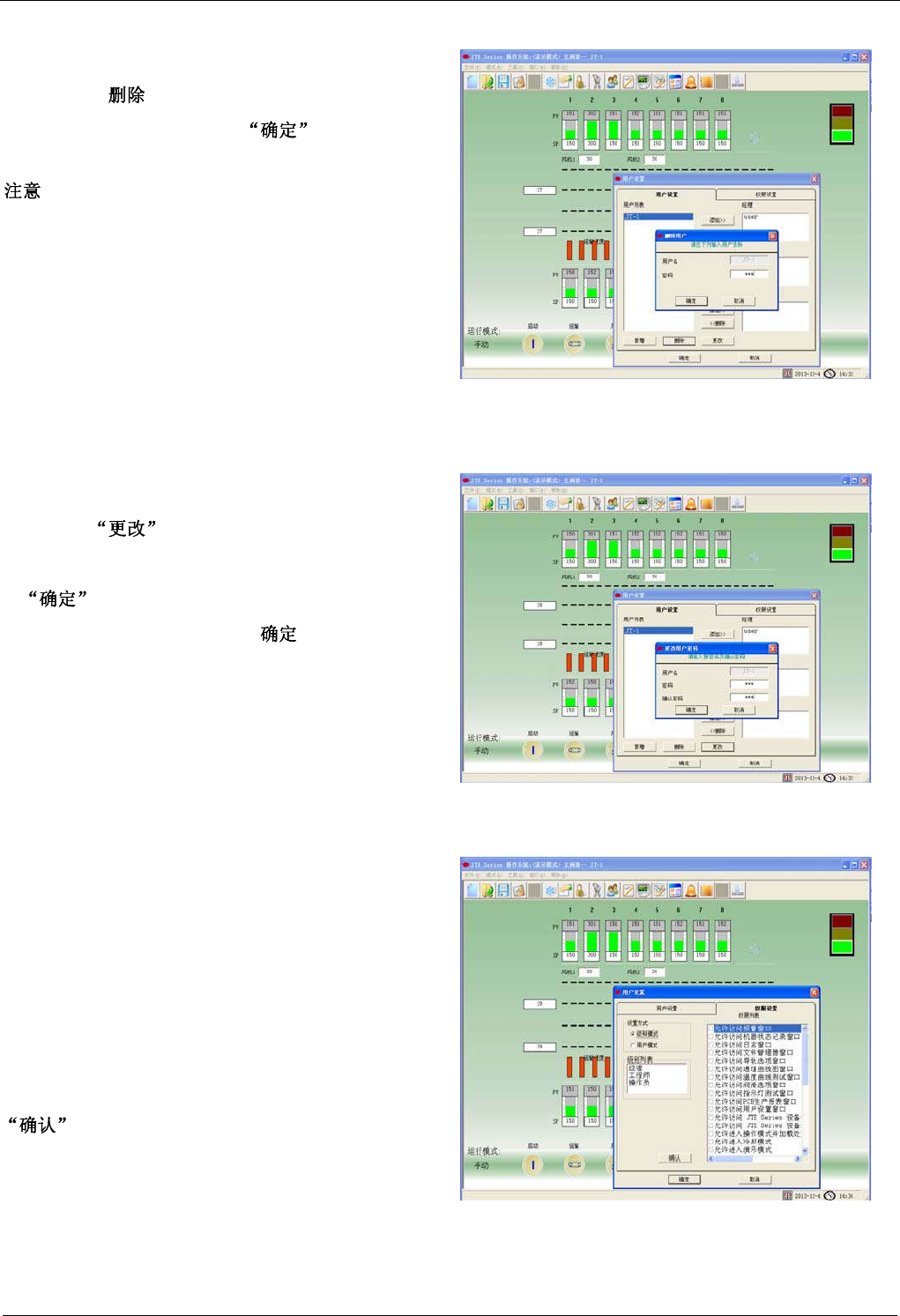 JTE 系列无铅回流焊机用户手册 软件操作 - 39 - 99 2 ,用户模式,管理员可对每个用户进行单独设置, 设定权限时,先选定所要设置的用户,在右边框显示的 权限栏中选择此用户所对应的权限, 最后按 键, 这这样每个用户都可具有不同的权限,设置更灵活。 最后按 键退出,这样便完成对用户管理的 操作。 4.3.12 用于防止非授权人员误操作。 锁定后系统将禁止除 “ ” 选项所有操作, 此时屏幕将会如右图画面。 4.3.13 ” 操…