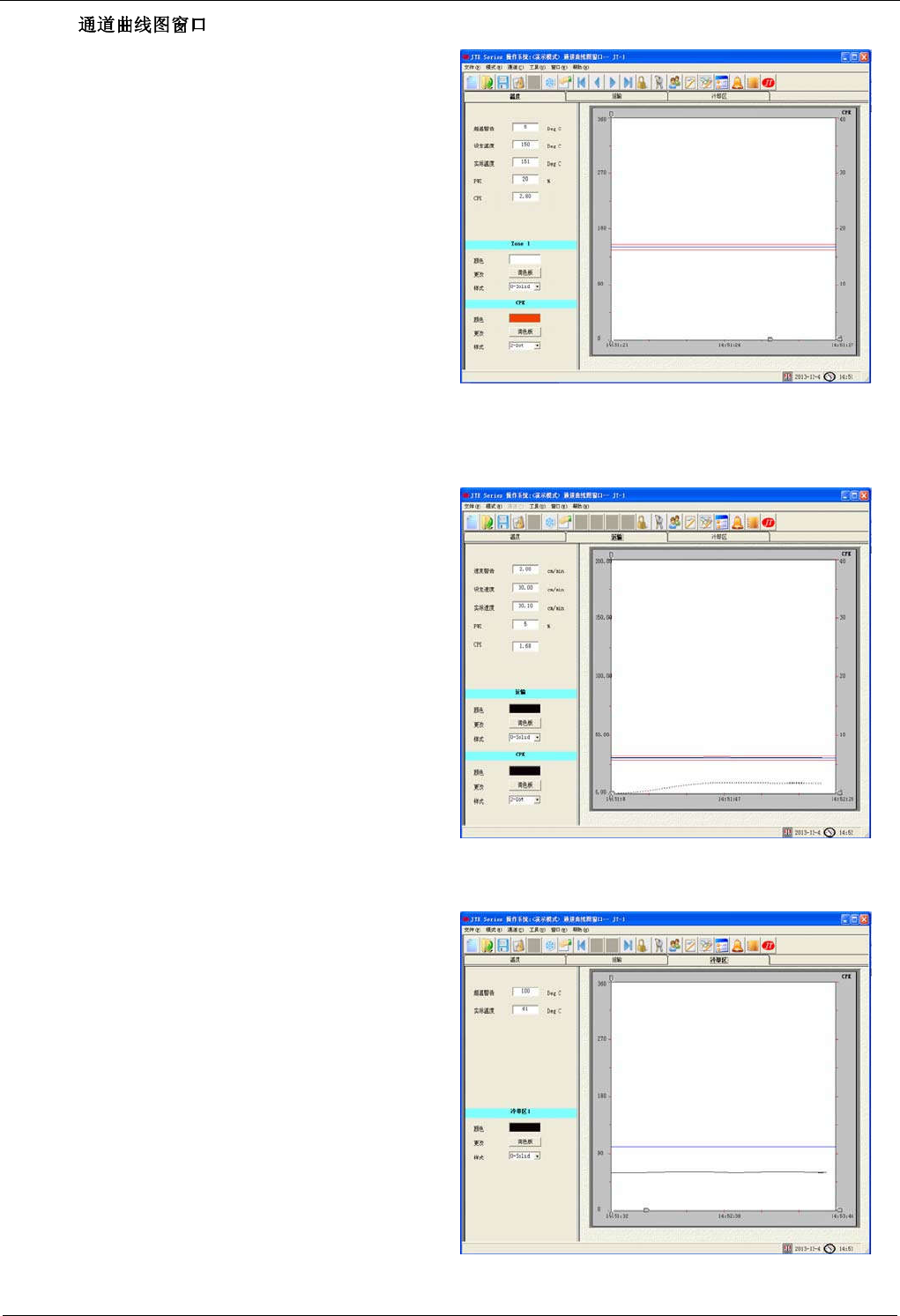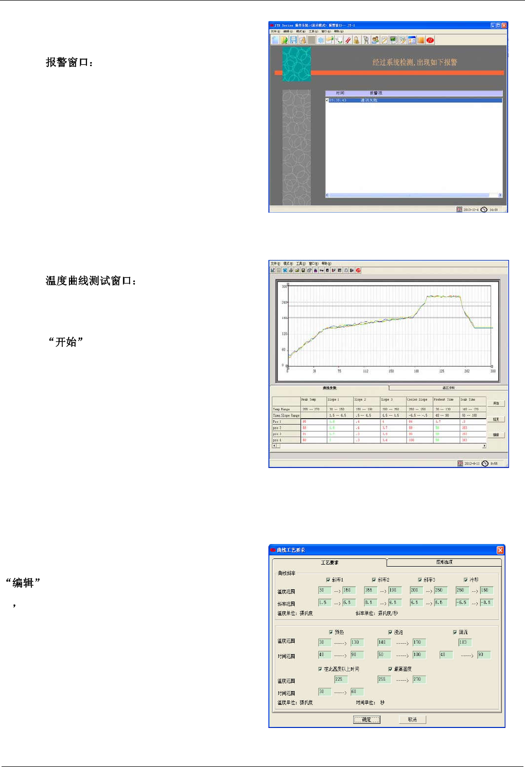 JTE 系列无铅回流焊机用户手册 软件操作 - 43 - 99 4.3.17.5 如右图画面, 显示当前报警表。 在此窗口可响 应报 警, 排除报警故障后 解除报警, 设备就可进入正常工作 状态。 4.3.17.6 用户采用外接测温头测试 PCB 板各点的温度时需 打开此窗口。 选择 选项后,系统会自动将实时测量并记 录各点温度值,在窗口处同步显示曲线图,测试完后系 统会将用户设定的曲线参数进行运算,并显示给用户分 析。 打印曲线图时,…