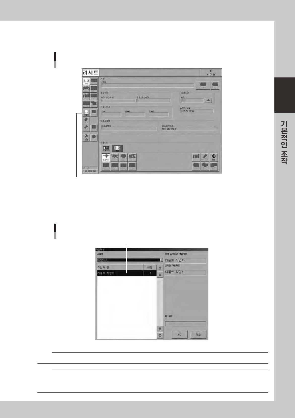 그리고 패스워드와 조작 레벨의 설정에 따라 작업자의 추 , 조작가 항목의 설정이 가능합니다 .