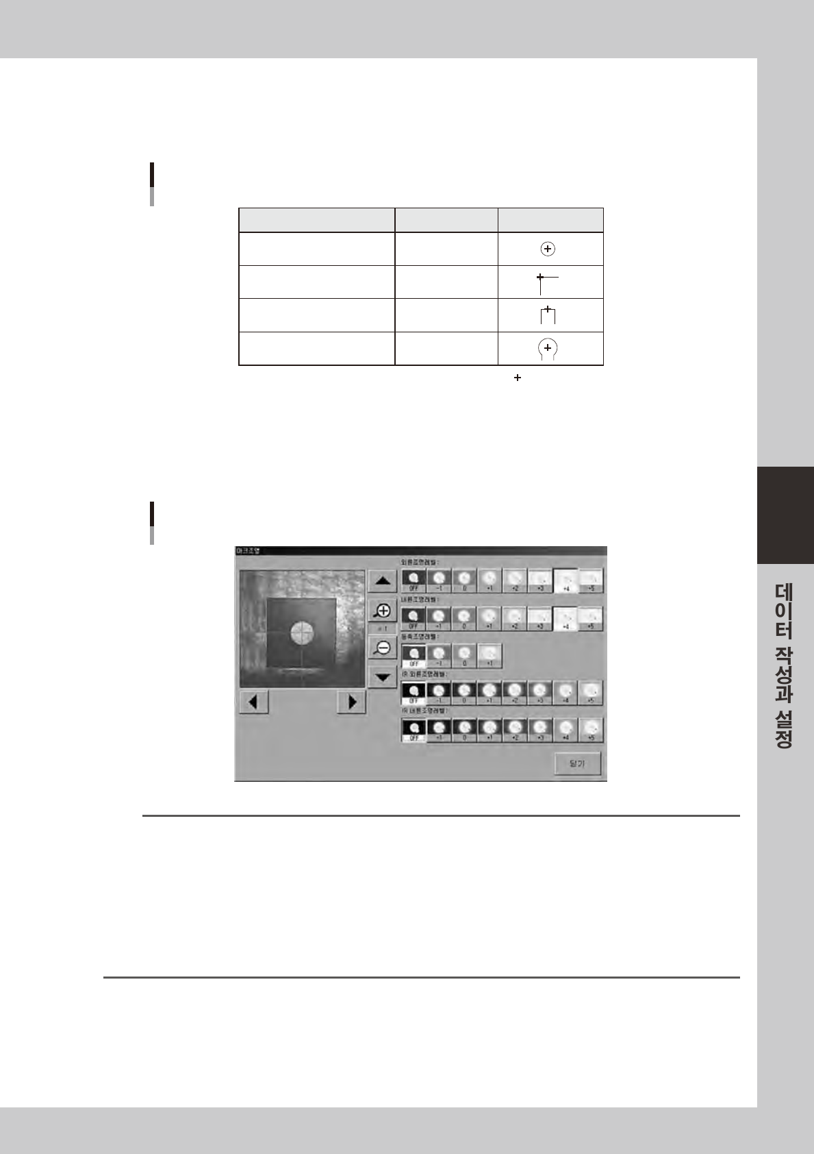 화면의중앙커서와마크가아래의표와같은관계로되어있음을확인하십시오 .위치가어긋난경우는