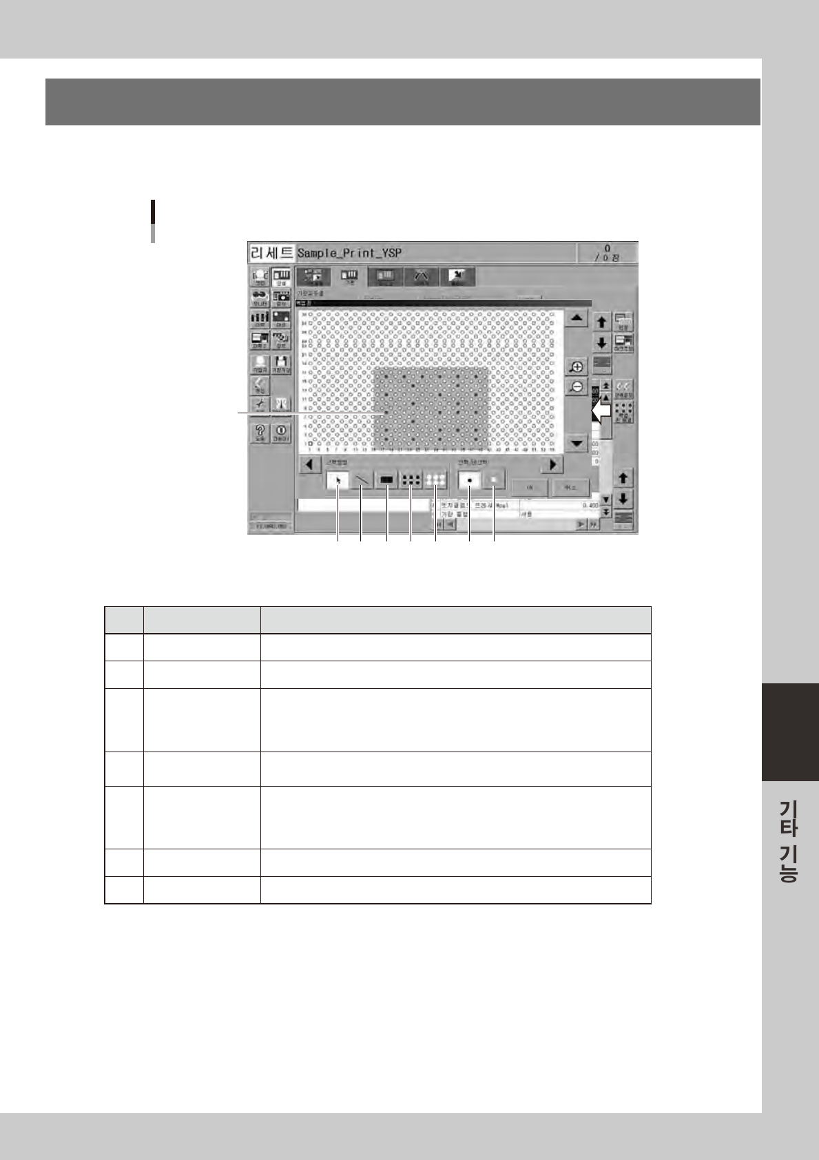 6-15 6 3. 백업 핀 배 열 [ 인 쇄 ] - 「기 판」탭 의 [ 백 업 핀배 열 ] 버튼 을누 르 면 「백업 핀」대 화창 이표시 됩 니 다 .이대 화 창의그래 픽 상 에 서 기 판 사이 즈에맞 는백 업 핀 (Matr i x핀 ) 의배 열 을등록해둘수있 습니 다 . 「백업핀」대화창 기판사이즈 2 3 4 5 6 7 1 686 1 4-L3- 00 █ 조 작버튼…