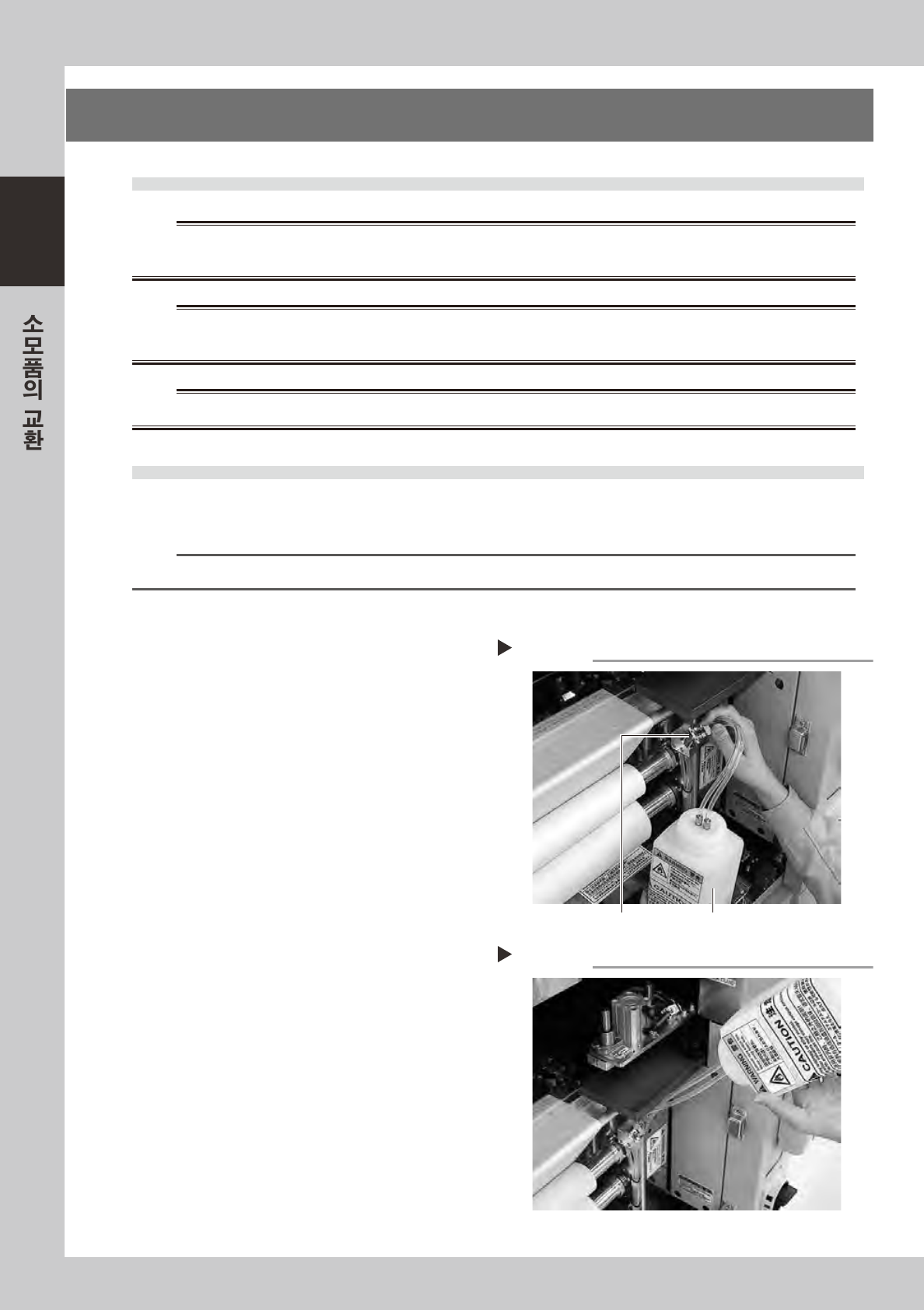 작업전에 용제는 원활하게 공급되도록 꽉 채워 두십시오 . 또 , 보틀의 캡은 확실하게 잠겨 있는지 확인해 주십시오 .