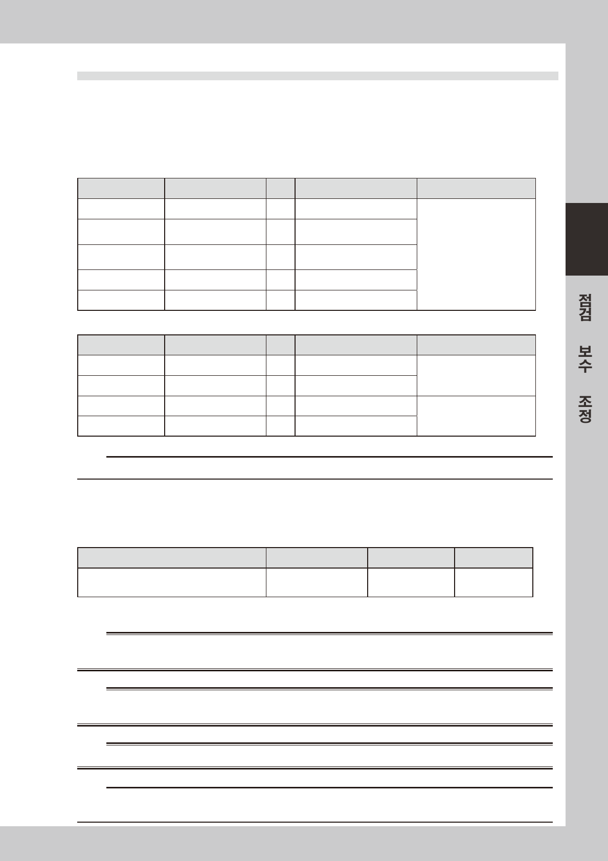 8-4 8 • • 2.2.3 정기 점 검 항 목의 일 람 효 율적 인 정 기 점검을 위 해서 , 점검 체크시트를 활용해 주 십시 오 . 전 항 에서 설 명 한 「일 상 점검 」이 외 에 매주 또는 매 월의 단 위로 실 행 하 실 점검내 용이 기재 되 어 있습니 다 . 다 음 페이 지의 「점 검 체크 시 트 ( 샘플 )」를 복사해서 활용하시거 나 , 임의 의 점검 체 크 시트 를 작성 하셔서 …
