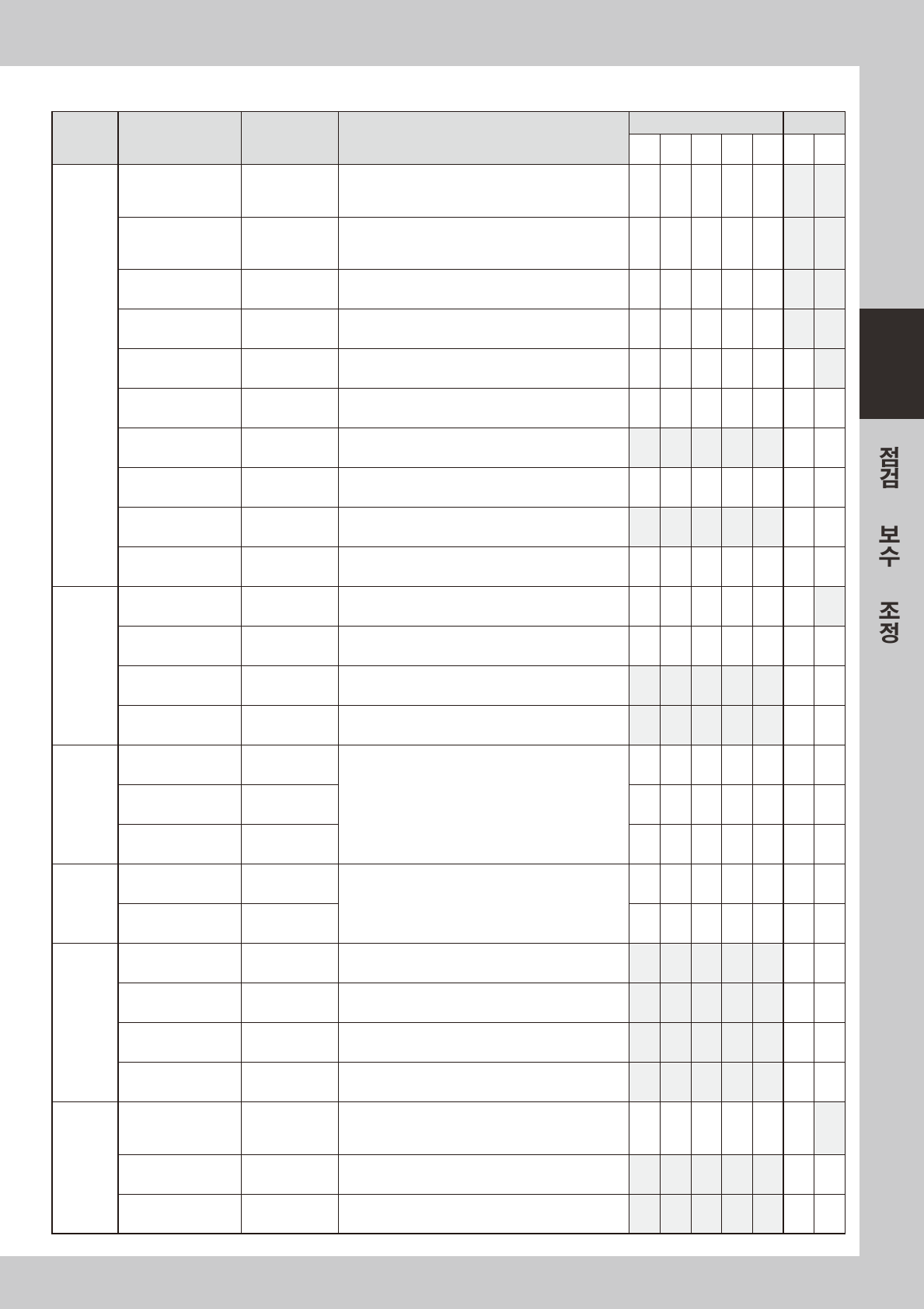 일상점검과 함께 매주 및 매월마다 점검•보수를 해 주십시오 . 기계의 가동시간이나 환경에 따라서는 점검
