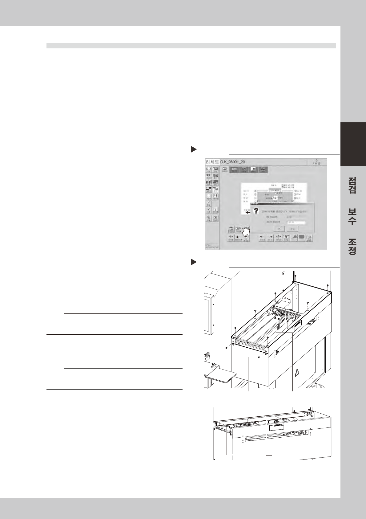 8-8 8 • • 4 벨 트 의 텐션을 느슨하게 합니다 . 육각 렌 치 (3mm) 로텐셔 너 ( 풀리브래킷 ) 의고정 볼 트 를분리 되 지않을정도로느 슨 하게해주십 시 오. 67812-L 3 - 0 0 5 컨베이어 벨 트 의 텐션을 조 정합니다 . 텐션 을강하게할경 우는 ,텐셔 너 ( 풀리브래 킷 ) 의고 정 볼 트체결 위 치 를본체 의안쪽방향으로 , 약하…