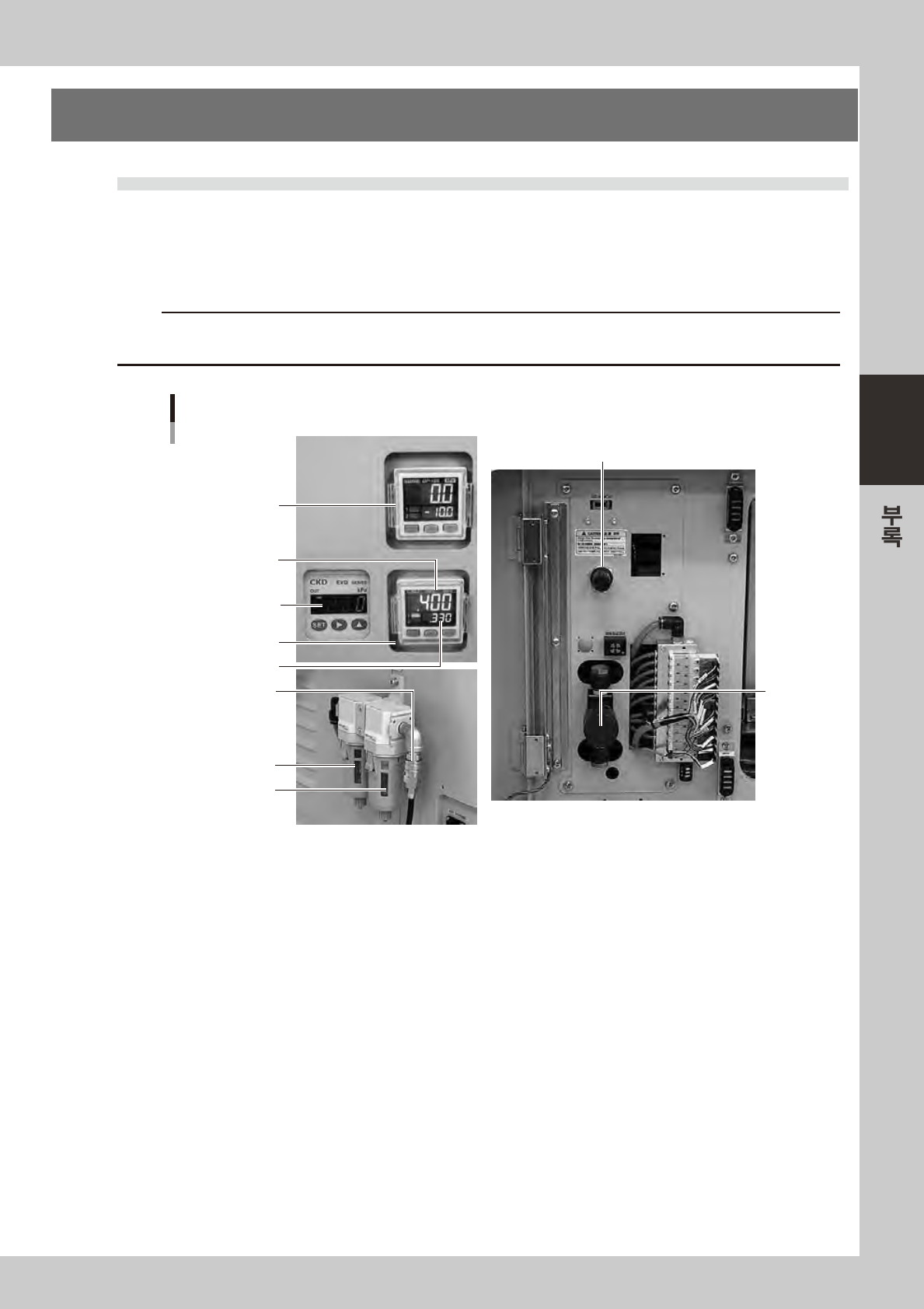 A-1 A 1. 사 양 1 .1 에어압 조정 부 1 .1 .1 공 급 에 어 본체 정 면 좌 측하단 패널내 에 본 기 계의 에 어 구 동 부에 공 급 하 는 에 어 압 조정 부 가 있 습니다 . 아 래의 적 정 치 로 설정 해 야 합니다 . c 주의 압력조절기 로에 어 압을설정 하 기전 에 ,본장 비 에공급되 는원에 어 압력이적 정 범위 (0.45MPa~ 0. 70MPa…
