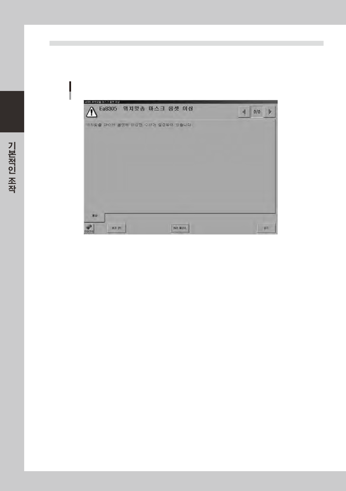 2-2 2 1. 2 에러의 클리 어 방법 운전 중 에 에 러가 발 생 하면 버저 가 울리면서 , 장비상부의 표시 등의 노 란 색 램프 가 점 등하 고 조작화면 의 스테 이 터스 에 리 어 에 도 「에러 」라 고 노 란색 으 로 표시됩 니 다 . 동시 에 에 러내 용 을 나타내는 화면 이 뜹니 다 . 에 러내 용 을 확 인 하 고 클 리 어 할때는 아래의 순서 에 따라 실 시 합니다 . 에러화…