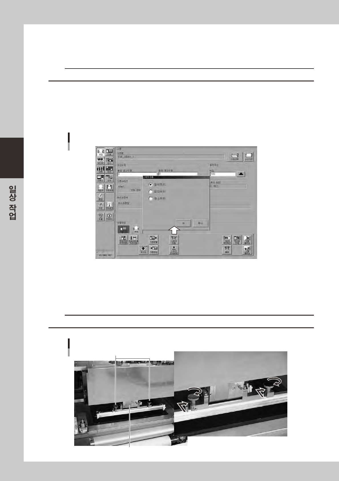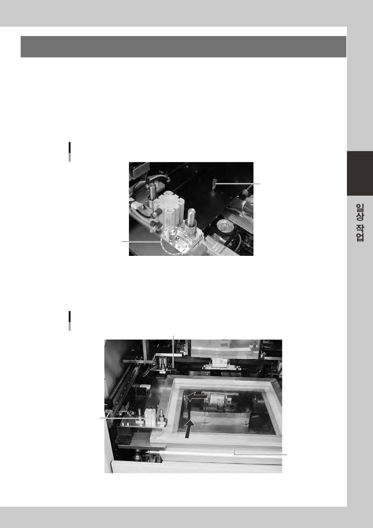 3-8 3 4 마 스 크를 클램프합니다 . 마스크 를인 쇄 테 이 블 의좌측안쪽 에대 이 게한상태 에서 ,마 스크우측 의마스크클램 프스 위 치 를오 른 쪽 으로돌려 서클램 프해주십 시 오 . c 주의 마스크클램프유 니 트에손 가락이끼이 지않 도 록주의 해주십 시 오 . 5 스퀴지 헤드를 「탈 착위치 」로 이동시킵니다 . 1 . 상부도 어 를닫…