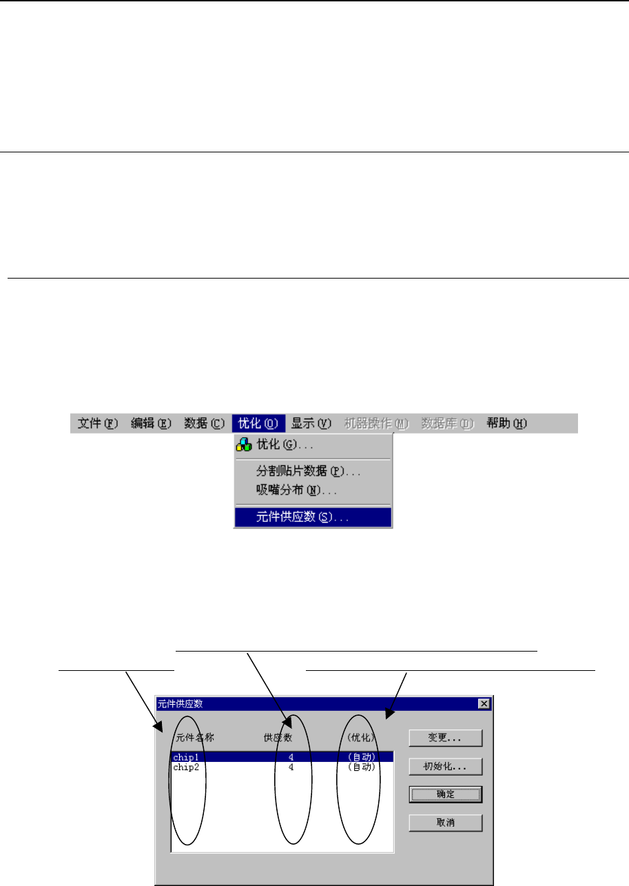 第 4 章 生产程序编辑 Rev03 4-4 优化 优化是对编辑程序制作的生产程序进行 ①送料器配置的优化 ②吸取贴片顺序的优化 的操作。 4-4-1 设定优化的条件 优化,受各种因素影响。 这些因素包括装置方面决定的项目和用户方面设定的项目。 这里就用户方面设定的项目进行说明。 4-4-1-1 元件供应数 当一种元件的贴片点数较突出(多)而只使用 1 个送料器时,会使生产效率失衡。这时, 如果送料器与元件有充裕,可用多个送料器供应相同…