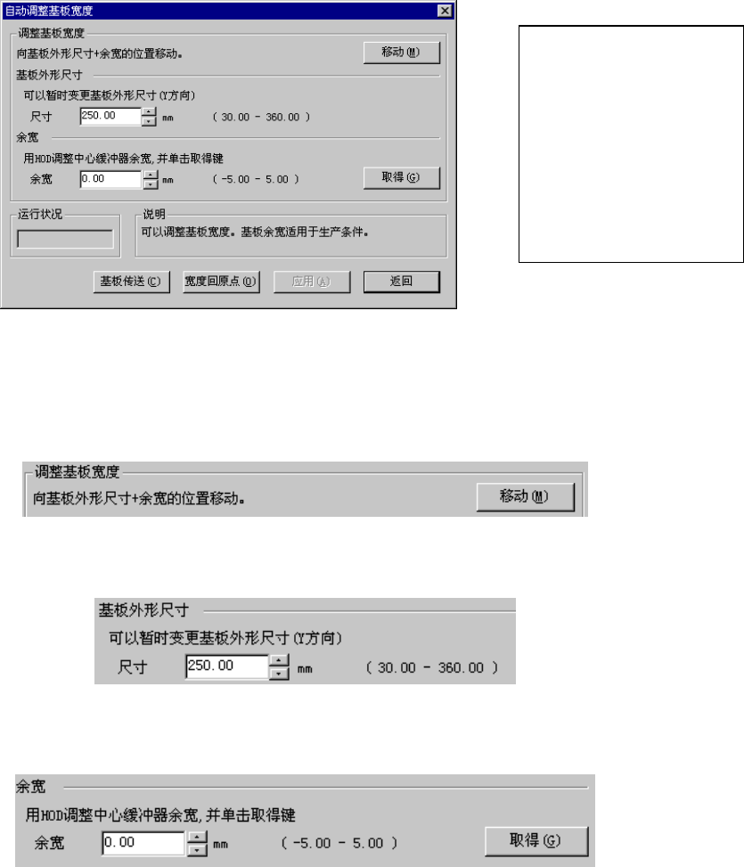 调整基板宽度,设置为:基板外形尺寸+余宽。执行时的传送宽度值,适用下列项目的