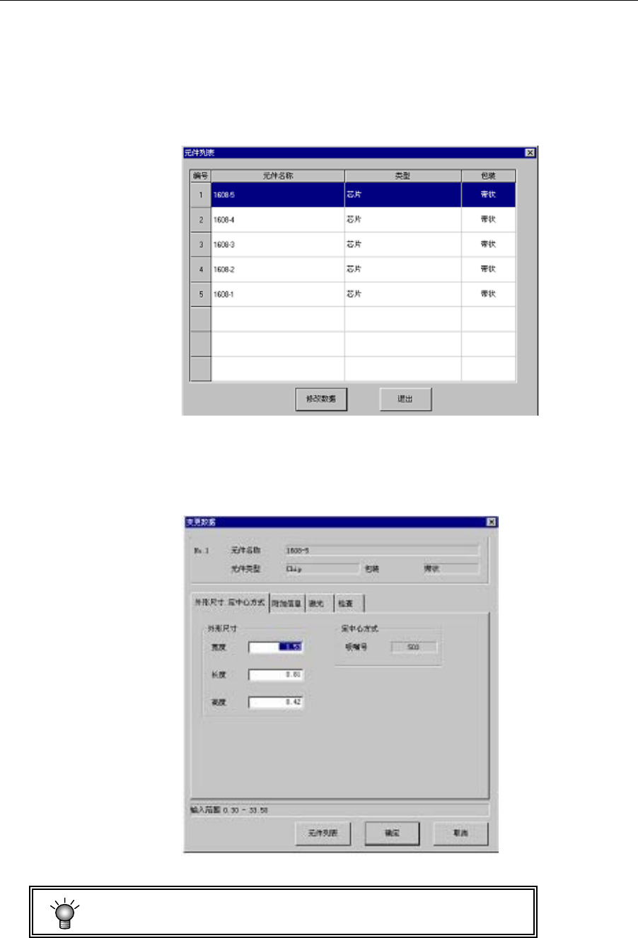第2章 生产 Rev03 2-10-3 数据变更 生产中遇到激光识别错误等情况时, 可以通过生产画面变更 “激光高度” 等 「元件数据」 , 进行再检测。 在菜单栏上选择「工具」/「数据变更」,显示如下元件列表画面。 选择需要变更数据的元件,单击「修改数据」。 图 2.10.3.1 元件列表 显示如下元件数据编辑画面。 对(估计是)产生错误的原因项目进行修正后,单击「确定」。 图 2.10. 3.2 变更数据 元件数据项目中,送料器种类…
