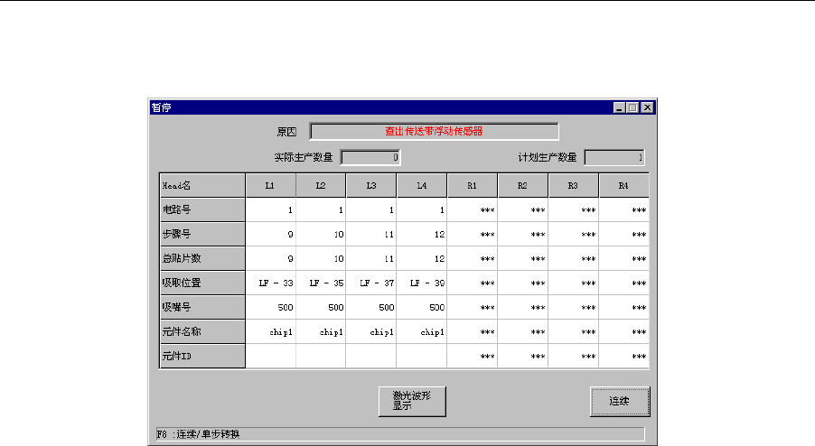在生产运行中(XY 轴承移动中)检测出传送带浮动,会显示如下信息,并进入暂停。若在