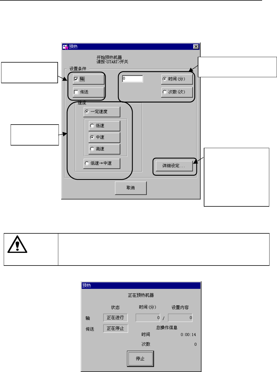 按下<START>开关后,轴开始运转,进入预热状态。在按下<START>开关前,请