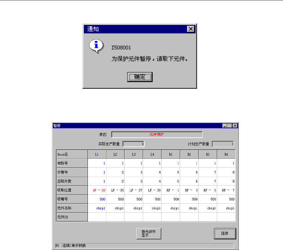 在生产运行中送料器台架下降时,显示如下画面,进入暂停状态。