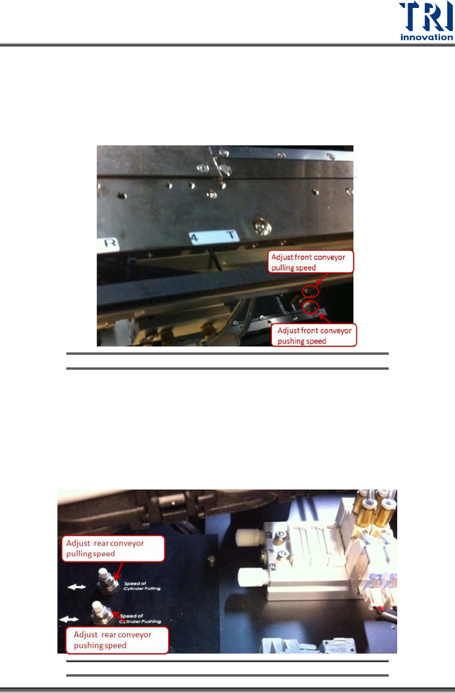 Test Research, Inc. TR7600 SIII Series User Gu ide – Hardwa re 51 Control the front conveyor Turn the upper knob clockwise to d ecrease f ront c onvey or pulling speed or turn the k nob counterclockwise to increase pul…