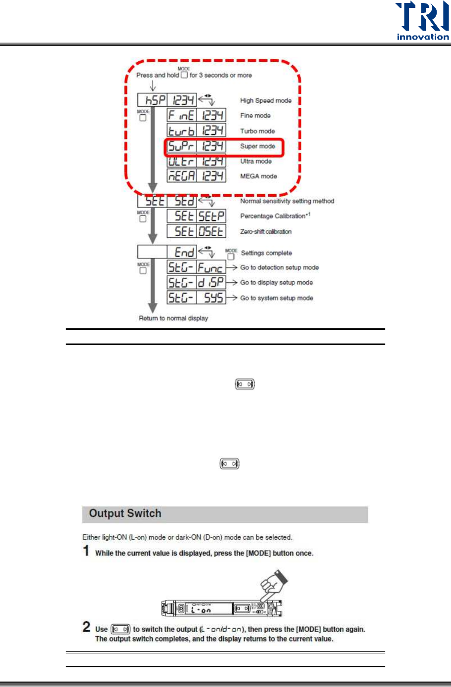 Test Research, Inc . TR7600 SIII Seri es User Gu ide – Hardw are 55 Figure 51: Digital Fib er Sensor/ [ Super] mode 3) Input the proper sensiti vity. a) After [Super] mode is c on firm ed, u se the to change the value to…