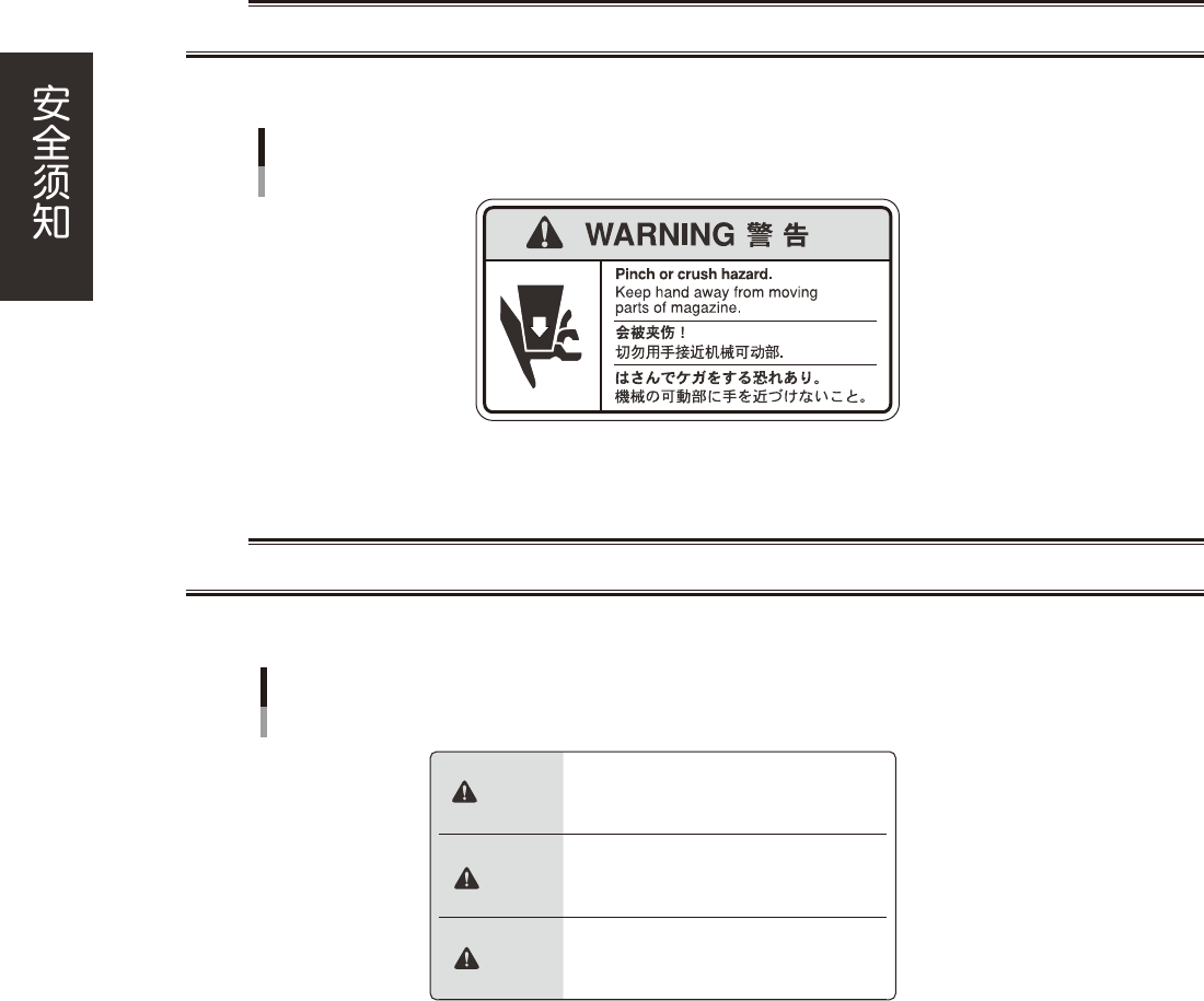 如在机器运行过程中将手伸入机器,手有被可动部和机盖夹伤的危险。