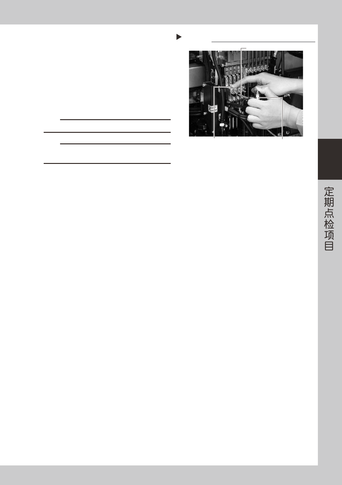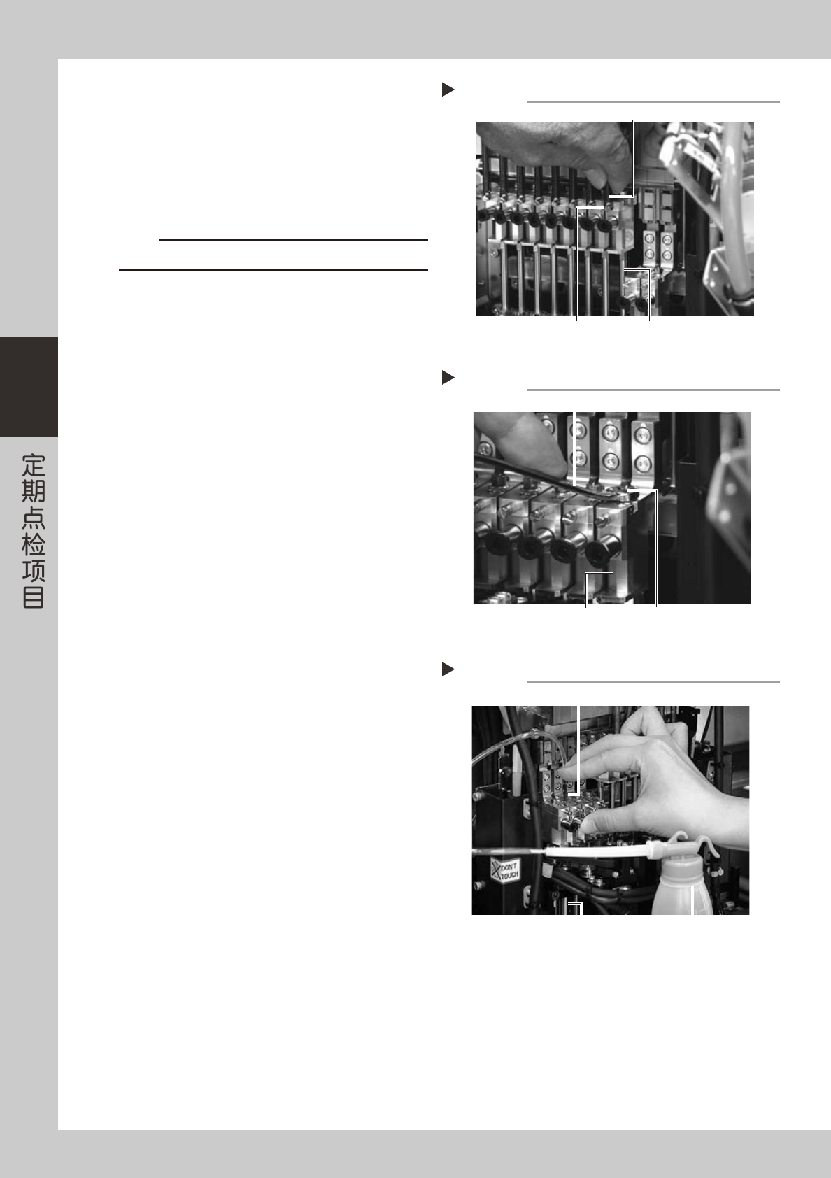 3-21 3 0 对多槽轴的空气通道实施喷气排屑。 1. 准备气枪(选件) ,与邻近的机器等连接。 2. 用手堵住拆下清洗用紧固螺栓的位置防止漏气, 一边用无尘布挡住多槽轴的前端部,一边对多 槽轴内实施喷气排屑。 55334-L5-00 3. 确认挡住多槽轴前端部的无尘布不再脏污后, 安装紧固螺栓。 反复进行 Step9 ~ Step10 的作业,直至从多槽 轴流出的 IPA 变清为止。 c 注意 排出的气体可能会吹到面部,务必配戴防…