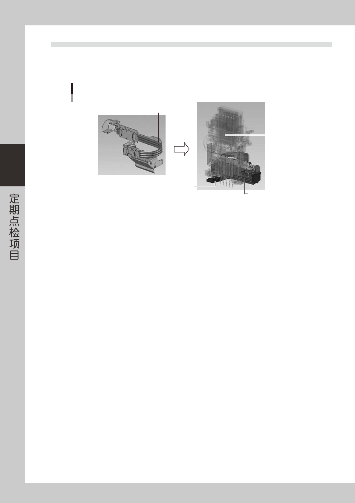 3-24 3 3.4 SC 轴软电缆的确认 SC 轴软电缆,是为配合扫描相机移动时线束不致下垂,而使电缆本身具有强度的平型复合电缆。但,长期使用会 因强度结构的老化、变形等导致电缆下垂,碰触 SC 轴的底板,引起故障,因此必须定期确认。下垂明显时应即时 更换。 SC轴部 确定SC轴软电缆状态 扫描相机部 Head部 确认软电缆下垂 55351-L5-00