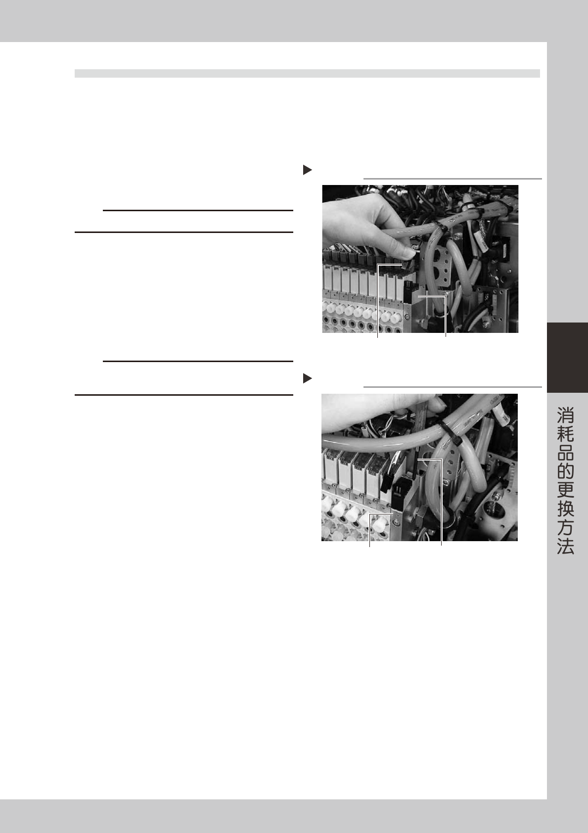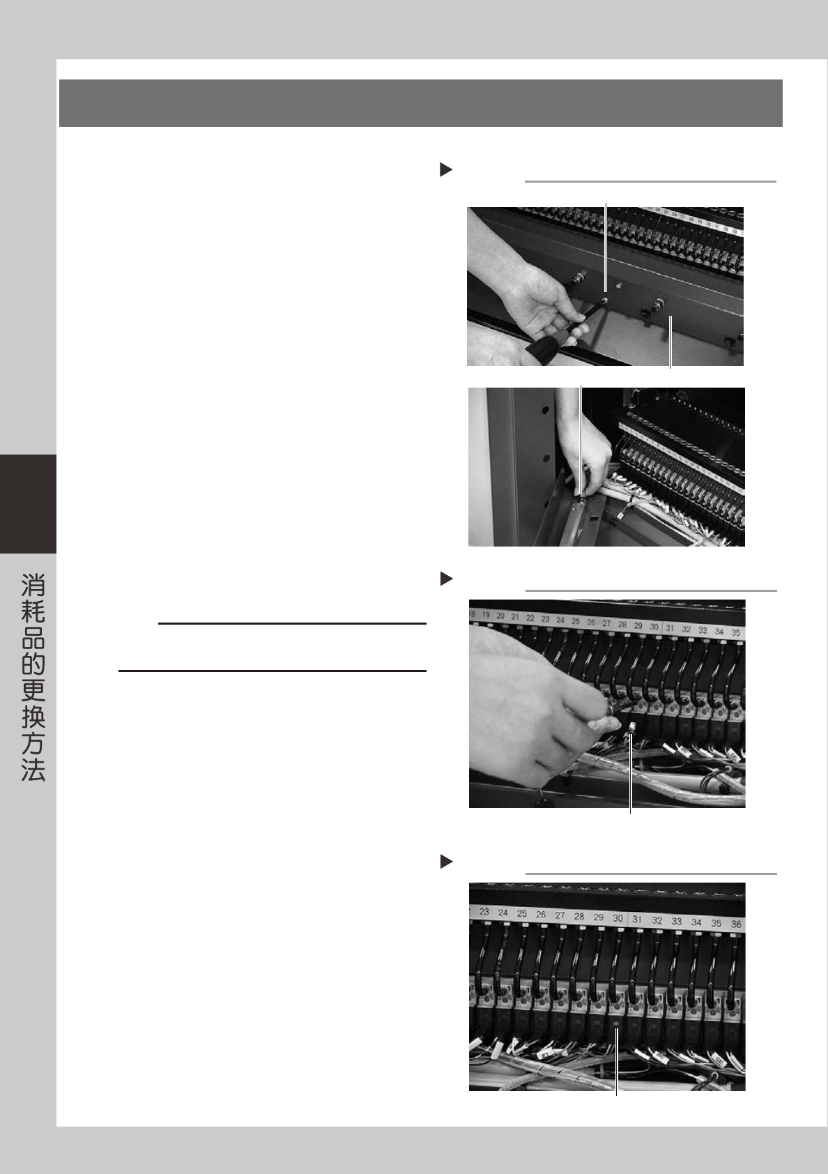 4-6 4 4. 送料器阀的更换(YG12) 1 关闭机器的电源。 退出应用程序 (VGOS),向左旋转机器的电源开关 , 关闭电源。 2 切断气源。 将贴片机左下方面板内的「供气/排气」开关向右 旋转,切断气源。 3 拆卸线束外罩。 1. 用十字螺丝刀拆下固定线束外罩的螺钉 (4 处 )。 2. 拆出连接在线束外罩的输气管。 55414-L5-00 4 拆卸送料器阀。 1. 拔出要更换阀的插头。 2. 用精密螺丝刀拆下送料器阀。…