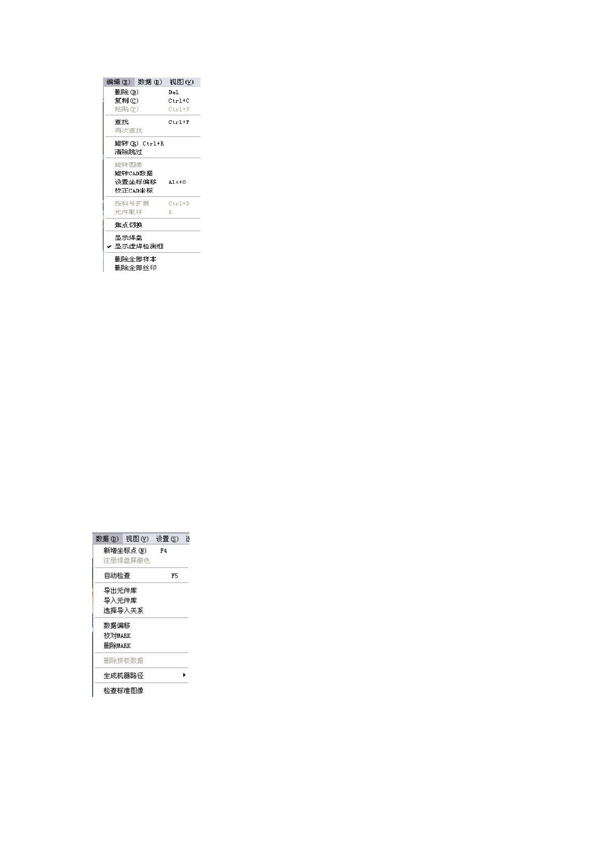 23 选择导入关系 :按照需求,选择 性的导入元件 库中的信息。 数据偏移:对 CAD 坐标 增加偏移补偿,达 到 PCB 板与 CA D 坐标一一对应 的目的。 校对 MAR K :校对 MARK 点。 删除 MAR K :删除 MARK 点。 删除拼板数据 :用于删除已编辑 的拼板数据。 生成机器路径 :生成生产时机器 照像检查的顺 序。 3.3.4 : “视图” 菜单 工具栏:用于 设置工具栏是否可 见。 状态栏:用于 设置状态栏…