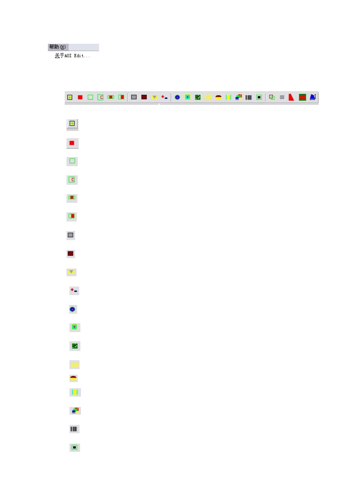 24 关于 AOIEDIT :显示关于 AOIEDIT 的信息。 3.4 类型定义栏介绍 1 、 定位框类型: 用于增加定位框。 2 、 CHIP 焊脚 类型:用来在 制作测试程序中, 给某个测试对 象添加电阻 / 电容的焊接测 试框。 3 、 PLCC 焊脚 类型:用来在制作 测试程序中,给某 个测试对象添 加 PLCC 的焊接脚框试 框。 4 、 三极管焊脚类 型:用来在制作测 试程序中,给 某个测试对象添加 三极管的焊接脚测 试框…