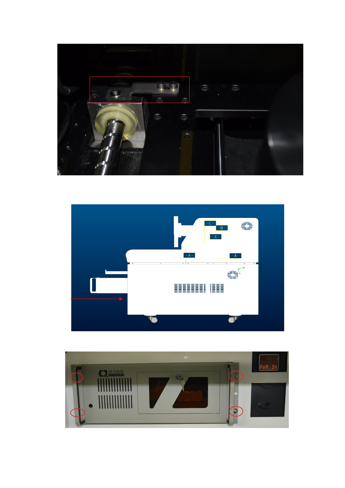 2.2 将工控电脑装入设备后,参照下图中红圈标示的位置将工控电脑前面的四个固定螺钉处锁紧,并在工控电