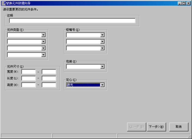 此功能可使用指定的条件统一替换指定的全部元件的“元件数据”中的“包装”、“定心”、