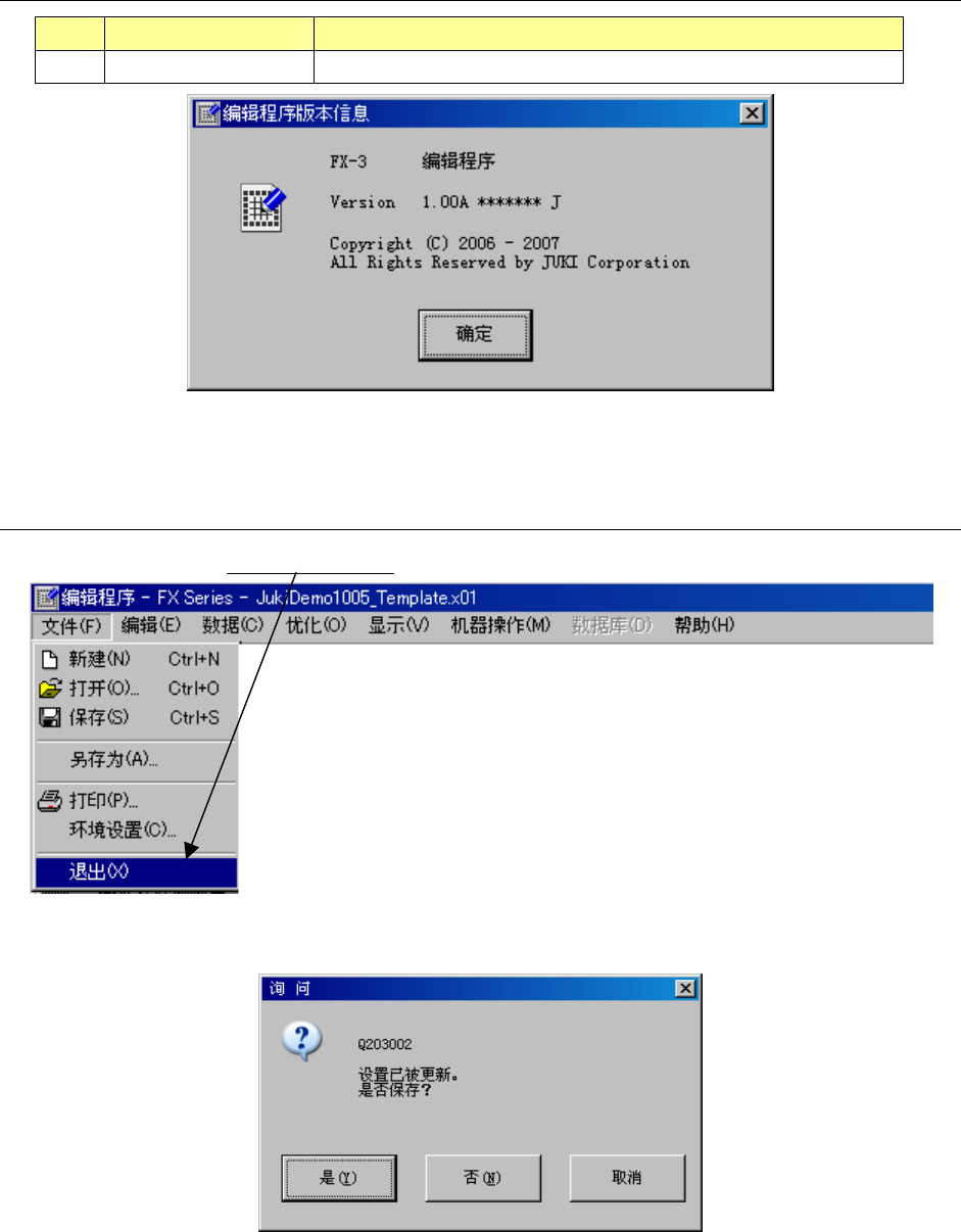 操作手册 II Rev00 2-176 2-5-6 帮助 No. 帮助组 说明 1 版本信息 显示编辑程序的有关信息。 图 2-5-6-1 编辑程序版本信息 (例) 2-5-7 退出编辑程序 从菜单栏中单击“文件” / “退出” 。 图 2-5-7-1 退出编辑程序 如果程序有所变更而尚未保存时,会显示如下提示信息。 图 2-5-7-2 退出时确认保存 ●“是” :保存。保存后退出程序编辑。 ●“否” :不保存,退出编辑程序。 ●“取消…