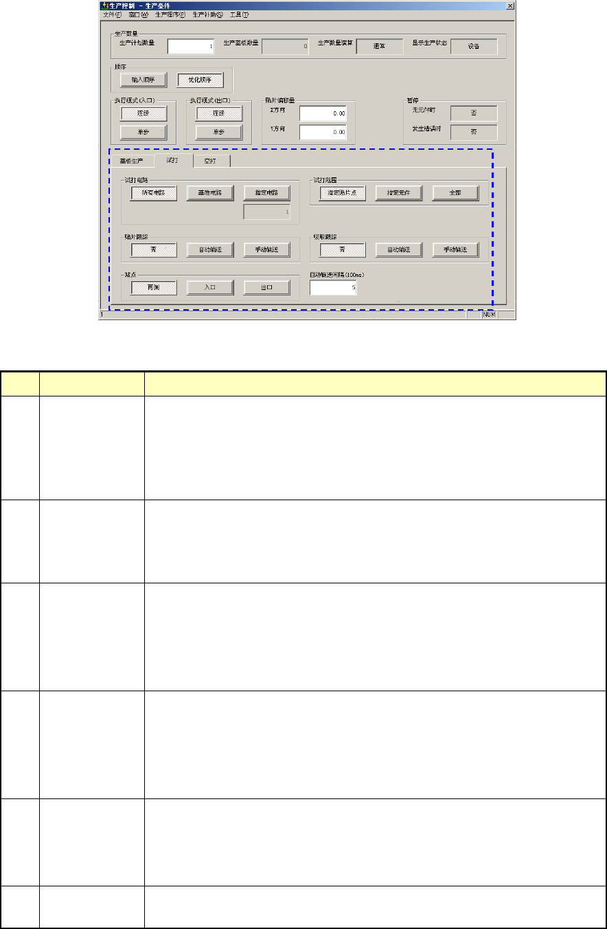 操作手册Ⅱ Rev00 3-9 (3) 空打 图 3-2-2-2-2 设定空打条件 No. 项目 内容 1 贴片范围 需限定贴片范围时,请输入开始步骤号和结束步骤号。 在总贴片点数项中显示每 1 电路中的总贴片步骤号。 仅在设定为输入顺序时适用。 2 贴片跟踪 设置在空打基板后,是否用摄像机进行贴片点跟踪, 以及跟踪时是自动输送还是手动输送。 ·否:不跟踪。 ·自动输送:自动跟踪贴片点。 · 手动输送:在贴片点停下来,由操作人员输入后才…