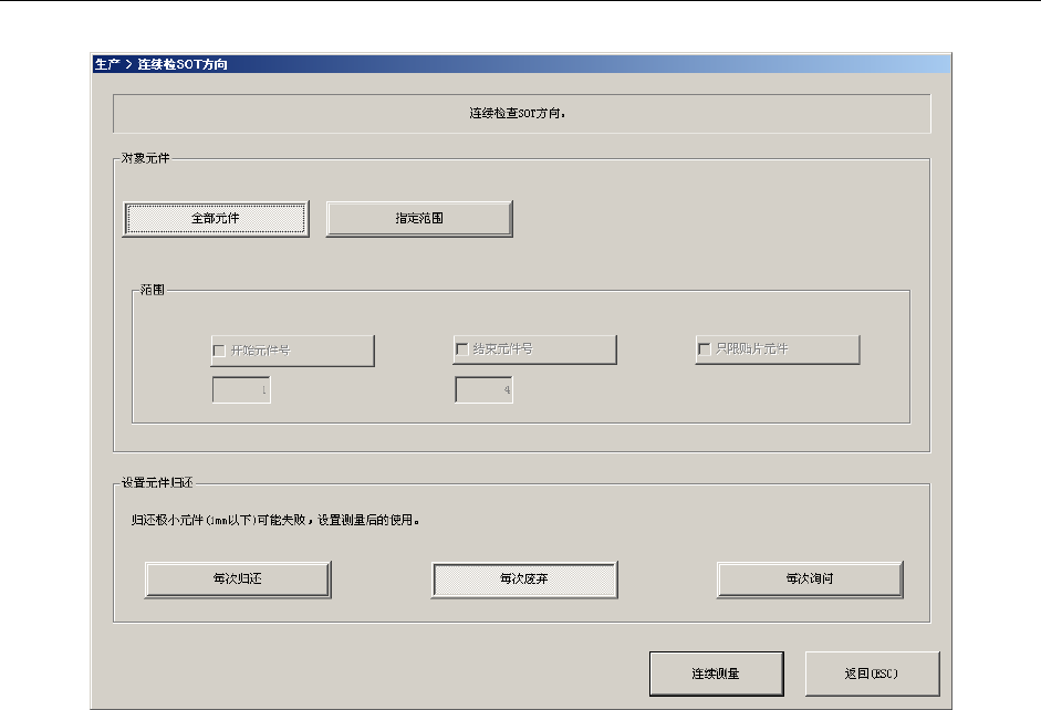 操作手册Ⅱ Rev00 3-70 3-5-4-4 连续检查 图 3-5-4-4-1 选择 SOT 方向连续检查画面 (1)对象元件 仅检查元件数据中某一条件与之一致的元件时,进行此项设定。 1) 全部元件 检查所有的元件数据。