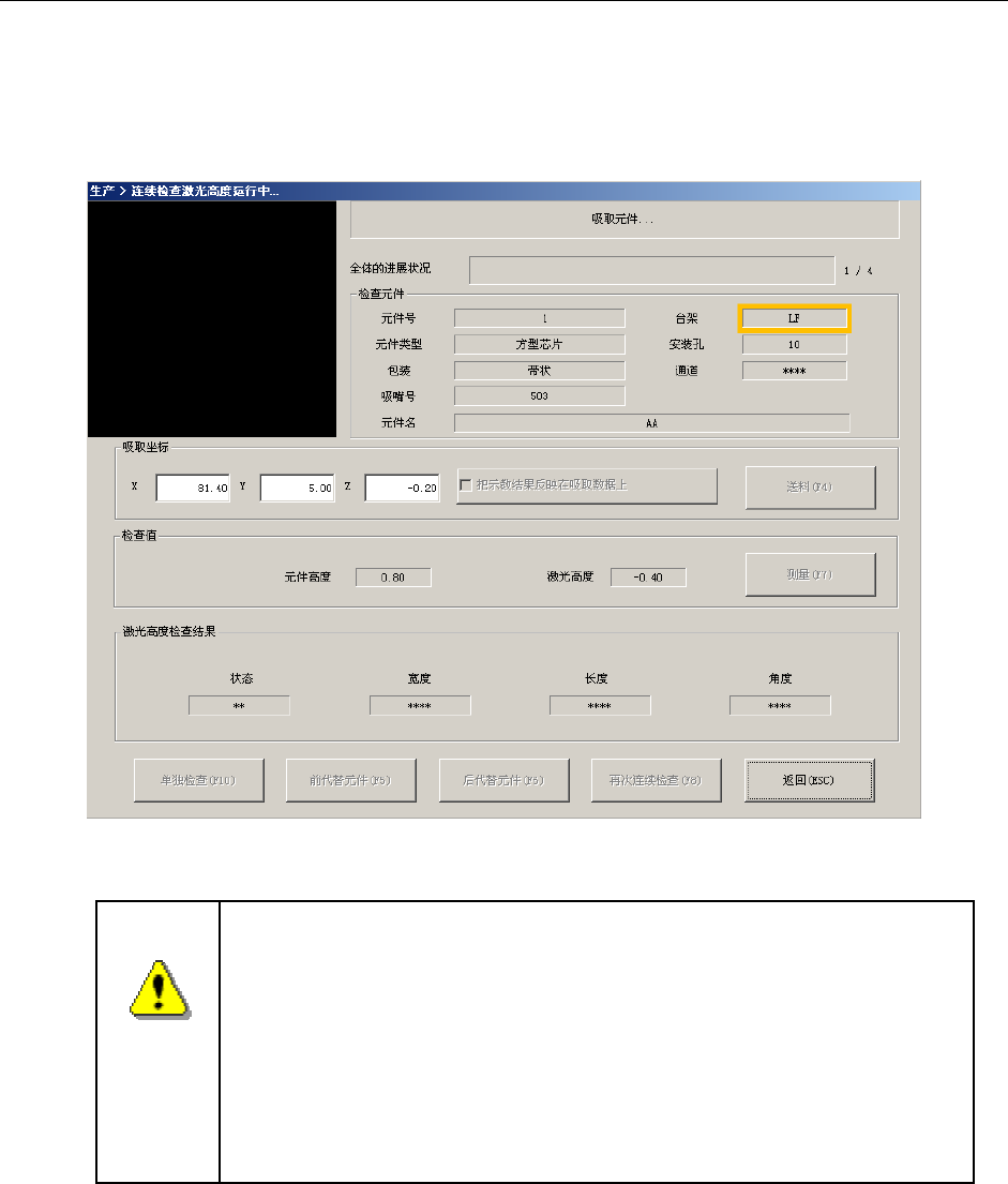 连续检查激光高度中,显示正在进行连续检查激光高度的元件内容/吸取位置/激光高度,依次