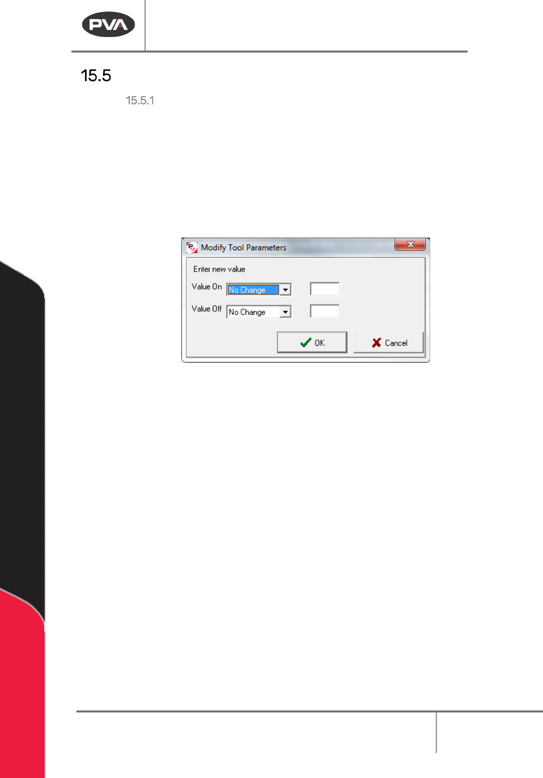 Machine Operati on Manual Revision L / February 2020 Page 146 of 2 00 Tool Parameters Modify Tool P arameters 1. Select Modify - > Tool Parameters. 2. Select ei ther Program or Selection . 3. For “Tool On” select eith…