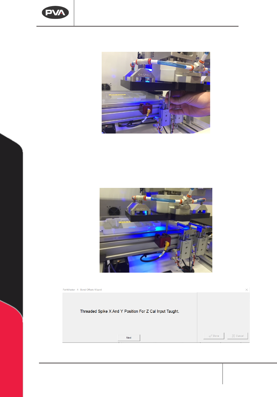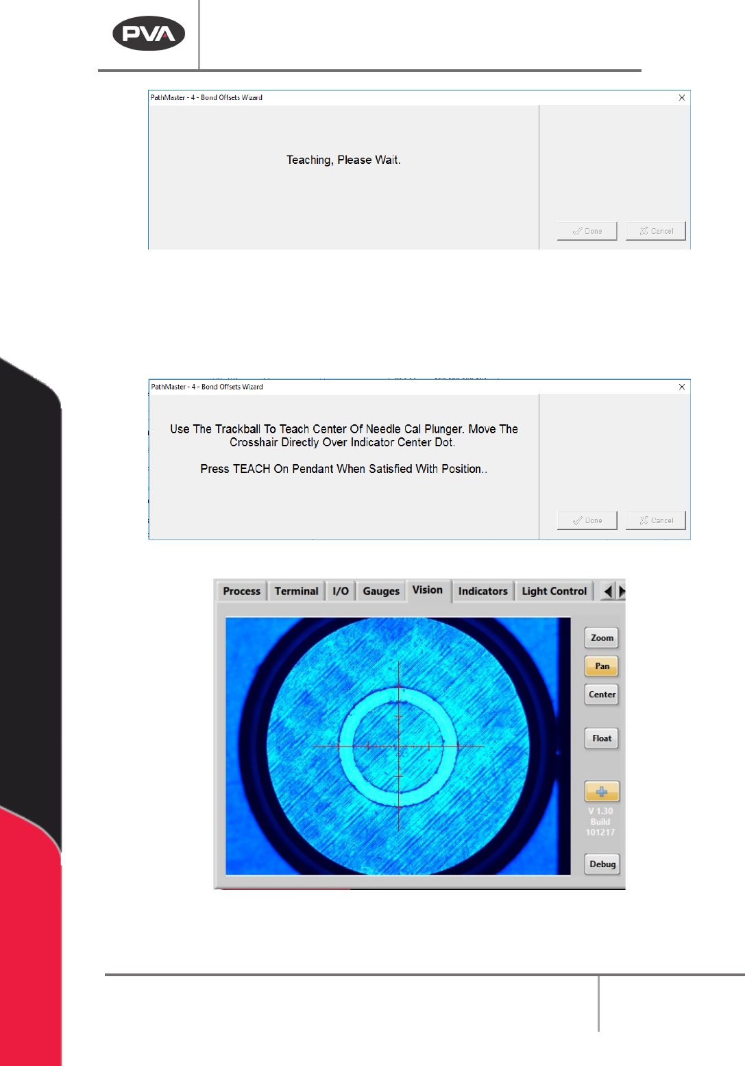 Machine Operati on Manual Revision L / February 2020 Page 189 of 200 Figure 207 : Teaching, Pleas e Wait 7. Us e t he teach penda nt to te ach the cente r of the needle c alibratio n plunge r as shown on the sc reen. U s…